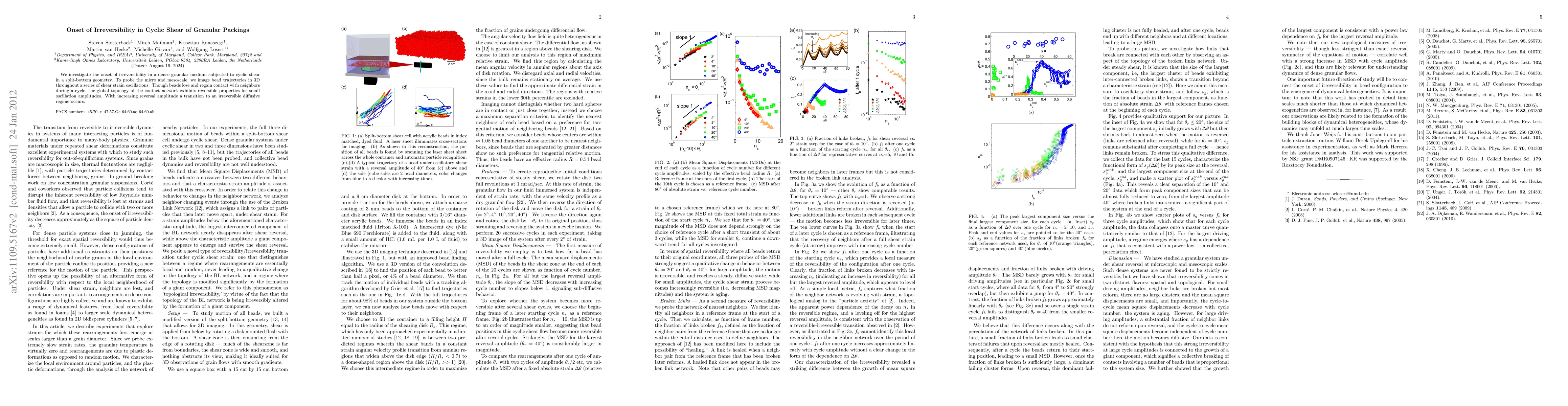 We investigate the onset of irreversibility in a dense granular medium subjected to cyclic shear in a split-bottom geometry. To probe the micro and mesoscale we image bead trajectories in 3D throughout a series of shear strain oscillations. Though beads lose and regain contact with neighbors during a cycle, the topology of the contact network exhibits reversible properties for small oscillation amplitudes. With increasing reversal amplitude a transition to an irreversible diffusive regime occurs.