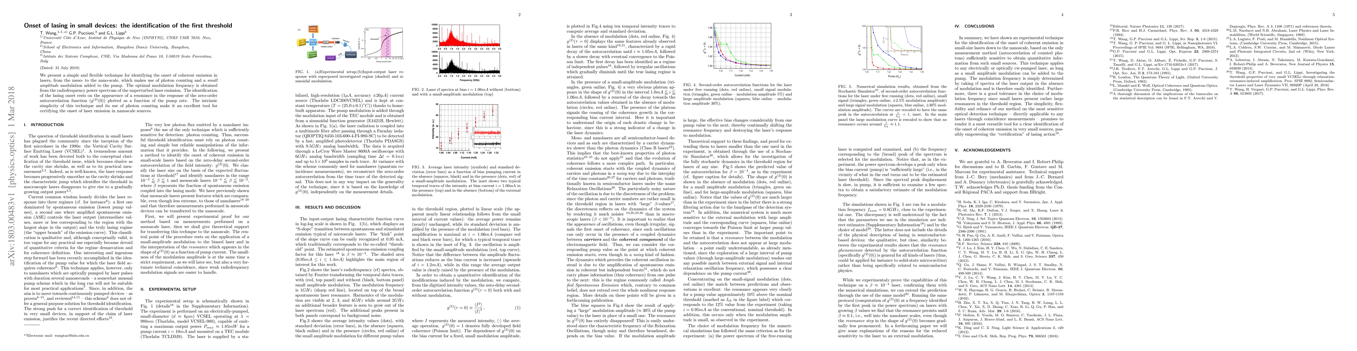 This paper introduces a straightforward method for detecting the onset of lasing in small devices by employing photon counting and a small amplitude modulation. The technique identifies the threshold through the appearance of a resonance in the zero-order autocorrelation function, making it effective for nanoscale laser sources.