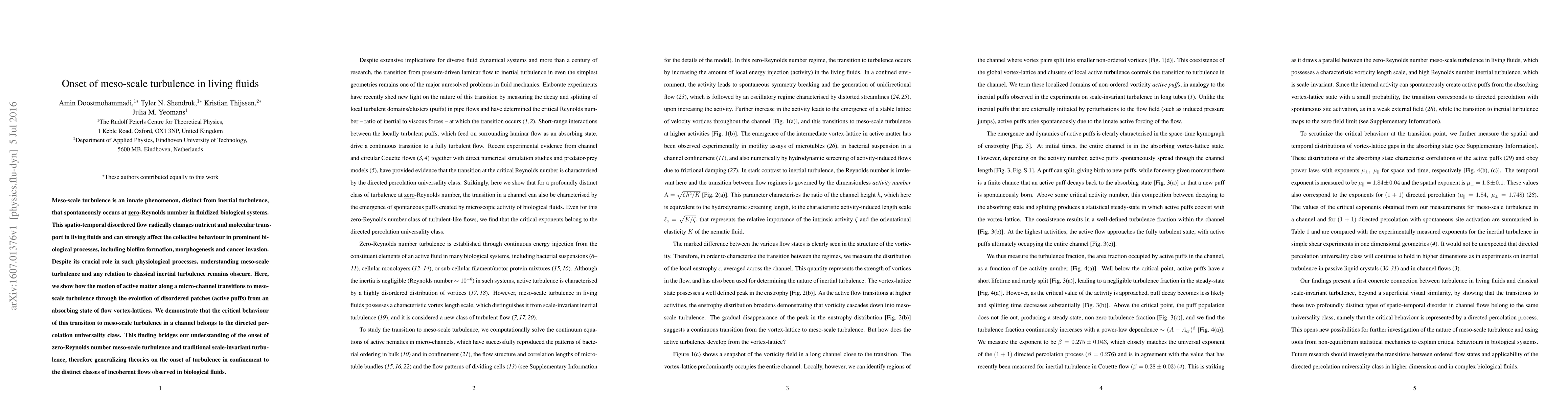 This paper investigates the onset of meso-scale turbulence in fluidized biological systems, showing how active matter in micro-channels transitions to this turbulence through disordered patches. It reveals that this transition belongs to the directed percolation universality class, bridging the understanding between meso-scale turbulence and traditional inertial turbulence.