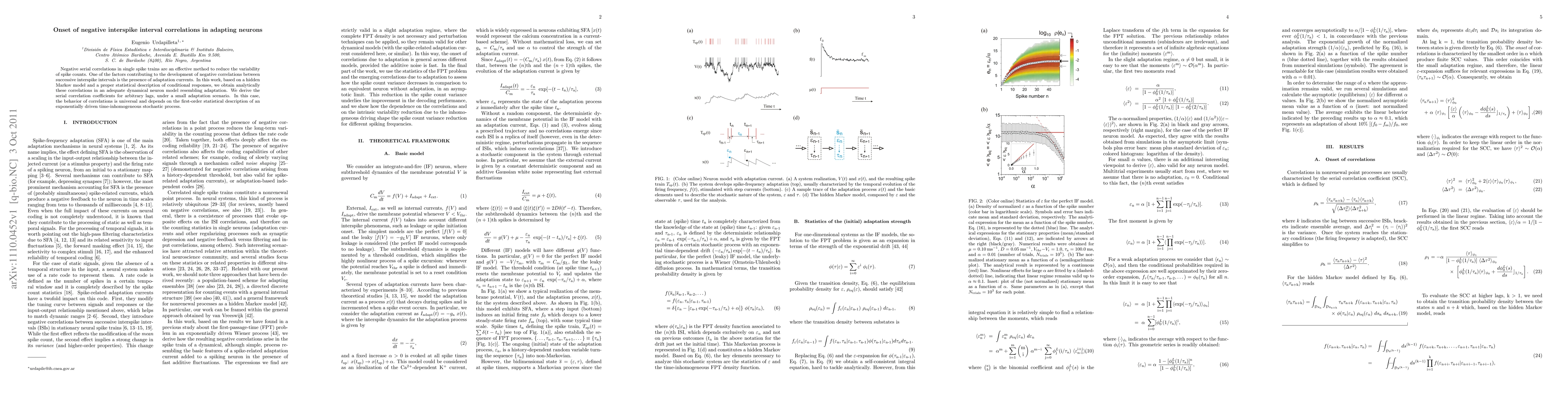 This paper analytically investigates the onset of negative interspike interval correlations in adapting neurons using a hidden Markov model. It finds that adaptation currents contribute to these correlations, which help reduce spike count variability, and derives the serial correlation coefficients for various lags under small adaptation.