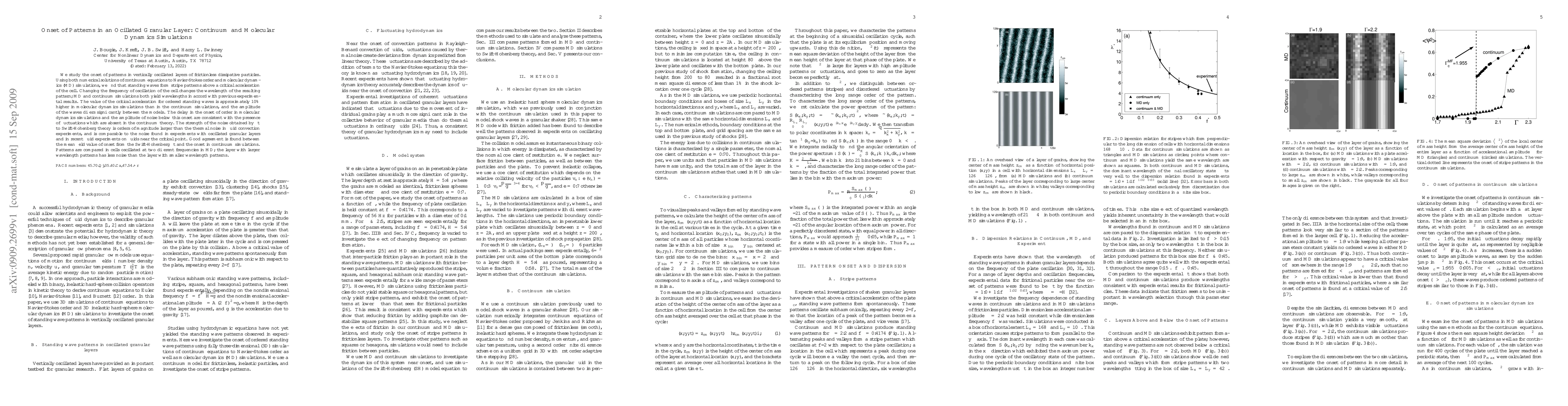 This research investigates the formation of stripe patterns in vertically oscillated granular layers using both continuum and molecular dynamics simulations. It finds that standing waves emerge above a critical acceleration, with pattern wavelength varying with oscillation frequency, and confirms the presence of fluctuations in molecular dynamics that are absent in continuum models.