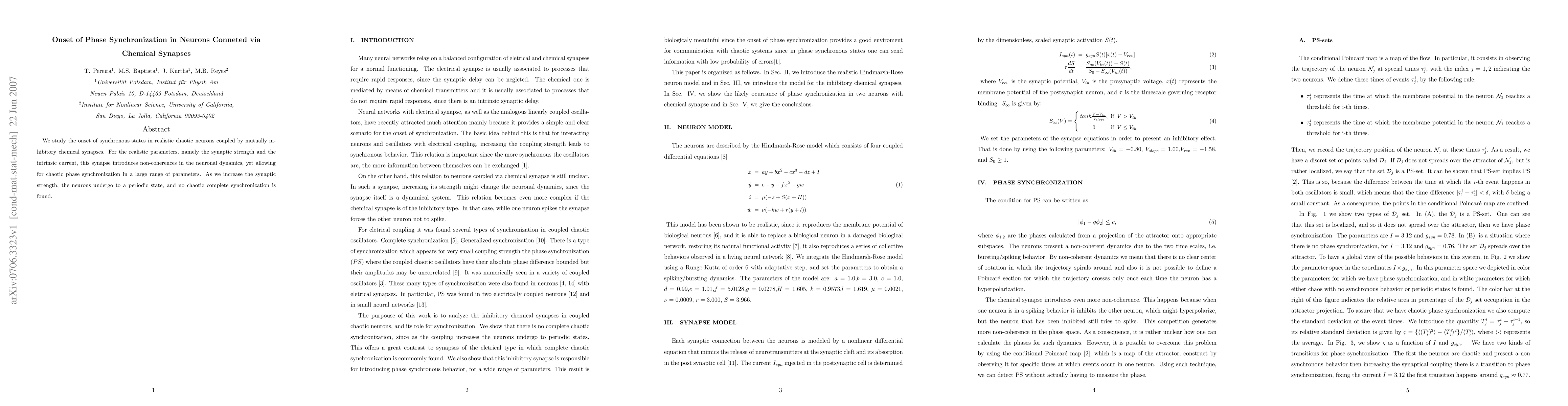 This study investigates the emergence of synchronous states in chaotic neurons connected via inhibitory chemical synapses, revealing that despite non-coherences, chaotic phase synchronization occurs over a broad parameter range. Increasing synaptic strength leads to periodic states without complete chaotic synchronization.