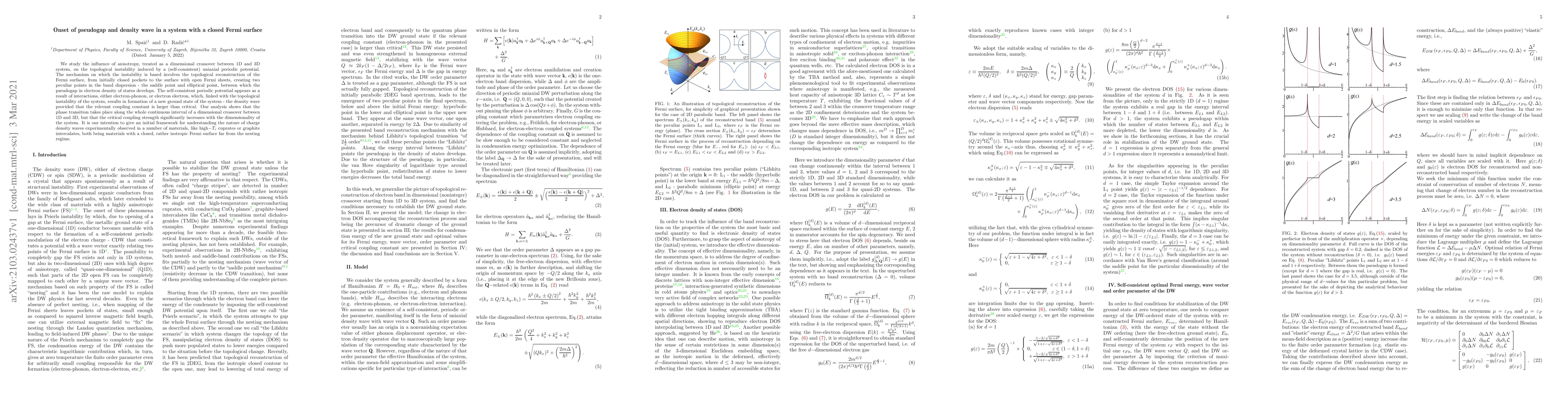 This paper investigates how anisotropy affects topological instability in a system with a closed Fermi surface, leading to the formation of a pseudogap and density wave. The analysis reveals that the critical coupling strength for the phase transition increases with dimensionality, providing a framework for understanding charge density waves in materials like high-$T_c$ cuprates and graphite intercalates.