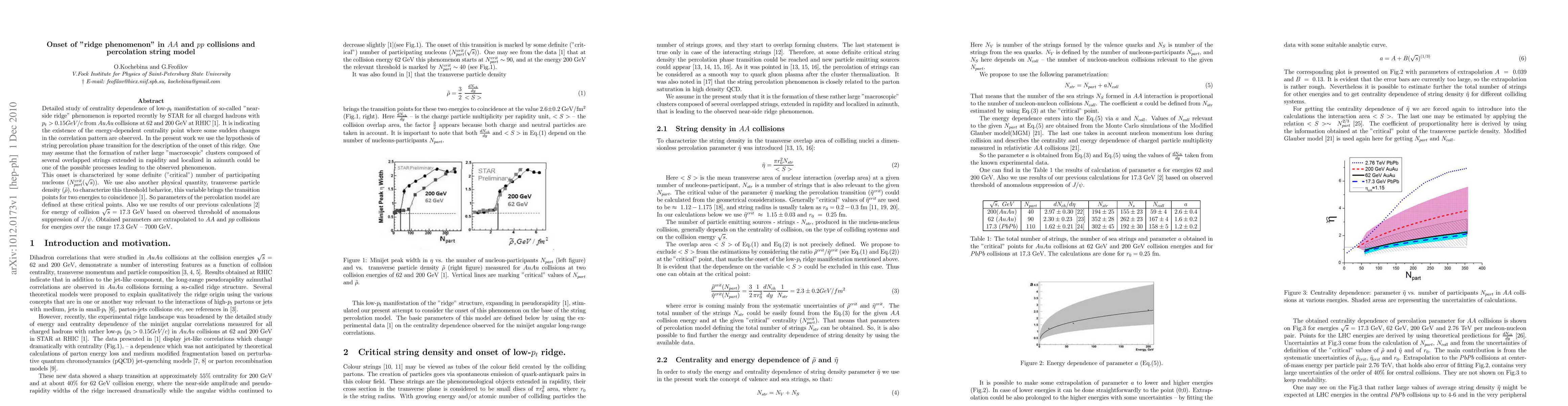 Detailed study of centrality dependence of low-p_t manifestation of so-called "near-side ridge" phenomenon is reported recently by STAR for all charged hadrons with p_t>0.15 GeV/c from AuAu collisions at 62 and 200 GeV at RHIC[1]. It is indicating the existence of the energy-dependent centrality point where some sudden changes in the correlation pattern are observed. In the present work we use the hypothesis of string percolation phase transition for the description of the onset of this ridge. One may assume that the formation of rather large "macroscopic" clusters composed of several overlapped strings extended in rapidity and localized in azimuth could be one of the possible processes leading to the observed phenomenon. This onset is characterized by some definite ("critical") number of participating nucleons. We use also another physical quantity, transverse particle density, to characterize this threshold behavior, this variable brings the transition points for two energies to coincidence [1]. So parameters of the percolation model are defined at these critical points. Also we use results of our previous calculations[2] for energy of collision 17.3 GeV based on observed threshold of anomalous suppression of J/psi. Obtained parameters are extrapolated to AA and pp collisions for energies over the range 17.3 GeV - 7000 GeV.