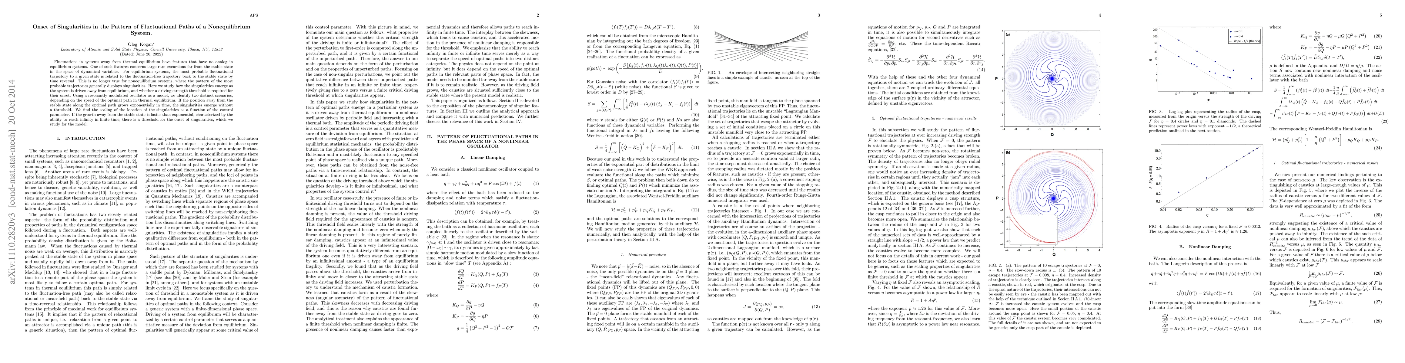 Fluctuations in systems away from thermal equilibrium have features that have no analog in equilibrium systems. One of such features concerns large rare excursions far from the stable state in the space of dynamical variables. For equilibrium systems, the most probable fluctuational trajectory to a given state is related to the fluctuation-free trajectory back to the stable state by time reversal. This is no longer true for nonequilibrium systems, where the pattern of the most probable trajectories generally displays singularities. Here we study how the singularities emerge as the system is driven away from equilibrium, and whether a driving strength threshold is required for their onset. Using a resonantly modulated oscillator as a model, we identify two distinct scenarios, depending on the speed of the optimal path in thermal equilibrium. If the position away from the stable state along the optimal path grows exponentially in time, the singularities emerge without a threshold. We find the scaling of the location of the singularities as a function of the control parameter. If the growth away from the stable state is faster than exponential, characterized by the ability to reach infinity in finite time, there is a threshold for the onset of singularities, which we study for the model.