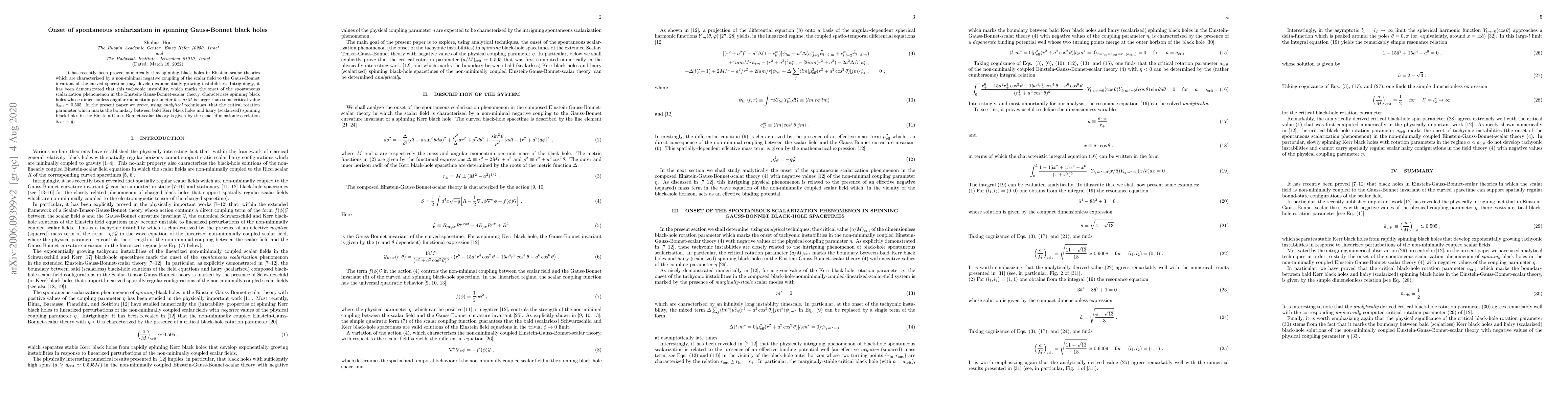 This paper analytically proves that spinning black holes in Einstein-Gauss-Bonnet-scalar theories undergo spontaneous scalarization when their dimensionless angular momentum exceeds ${\bar a}_{\text{crit}}={1\over 2}$. This marks the transition from bald Kerr black holes to scalarized, or "hairy," black holes.