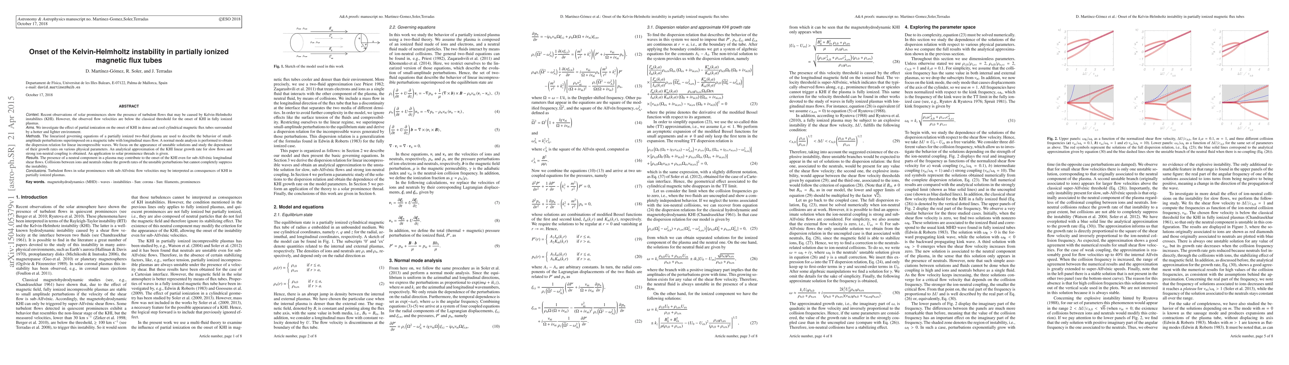 This paper explores how partial ionization influences the onset of Kelvin-Helmholtz instability in magnetic flux tubes, finding that neutral components can trigger the instability even at sub-Alfvénic flow speeds, suggesting a mechanism for turbulent flows in solar prominences.