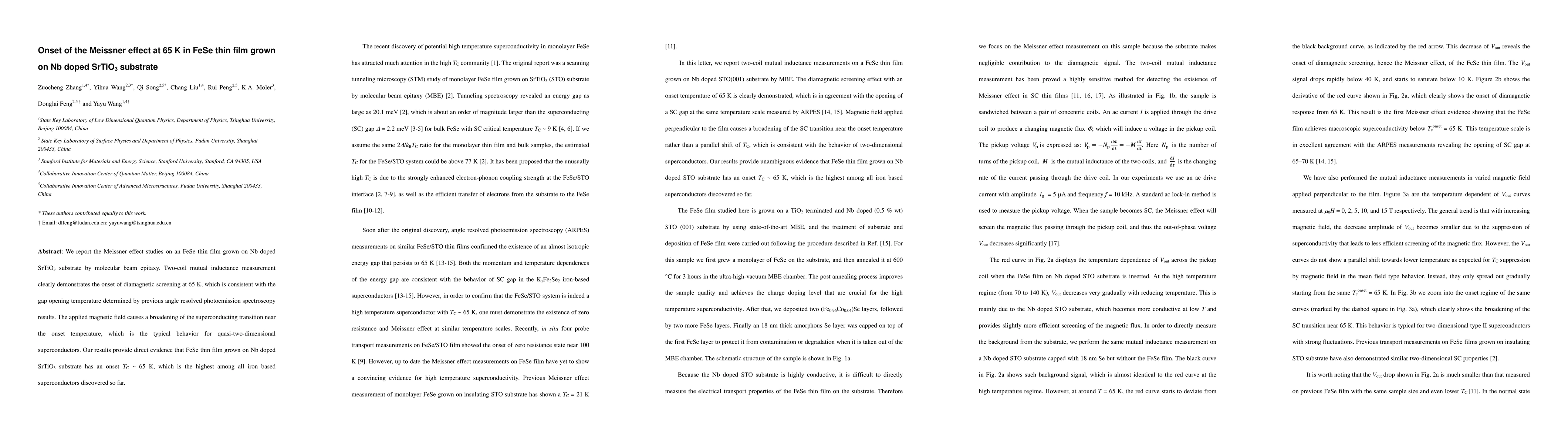 This study demonstrates the onset of the Meissner effect in FeSe thin films on Nb doped SrTiO3 at 65 K, confirming superconducting behavior and establishing it as the highest temperature among iron-based superconductors. The superconducting transition broadens under magnetic fields, typical of quasi-two-dimensional superconductors.