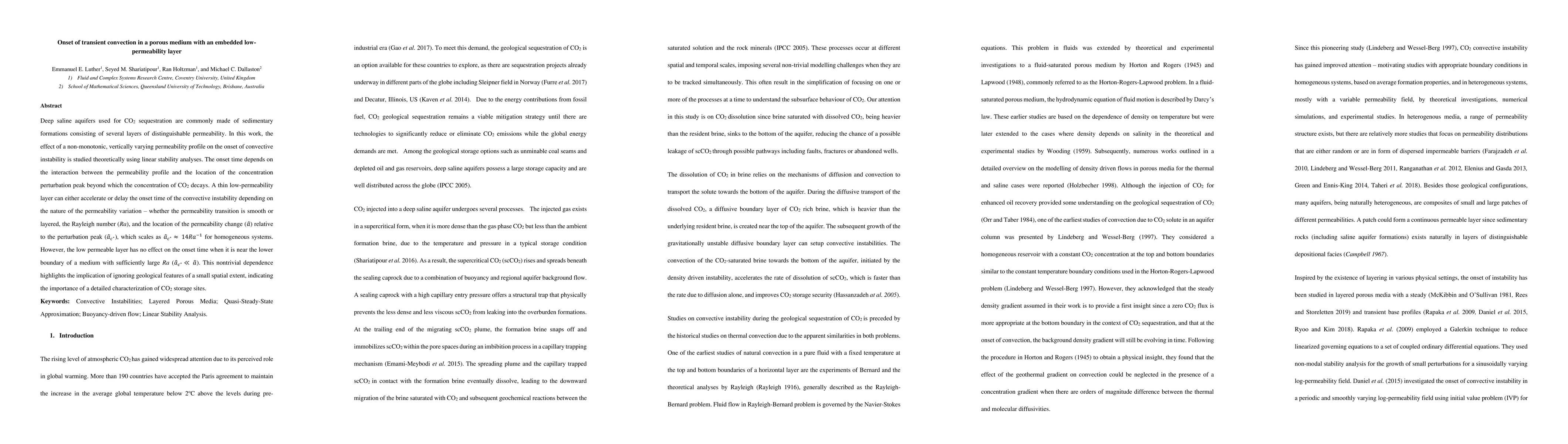 This study investigates how varying permeability profiles in deep saline aquifers affect the onset of transient convection, crucial for CO$_2$ sequestration. It finds that a thin low-permeability layer can either accelerate or delay convective instability depending on the permeability transition nature, Rayleigh number, and the layer's location relative to the concentration perturbation peak.