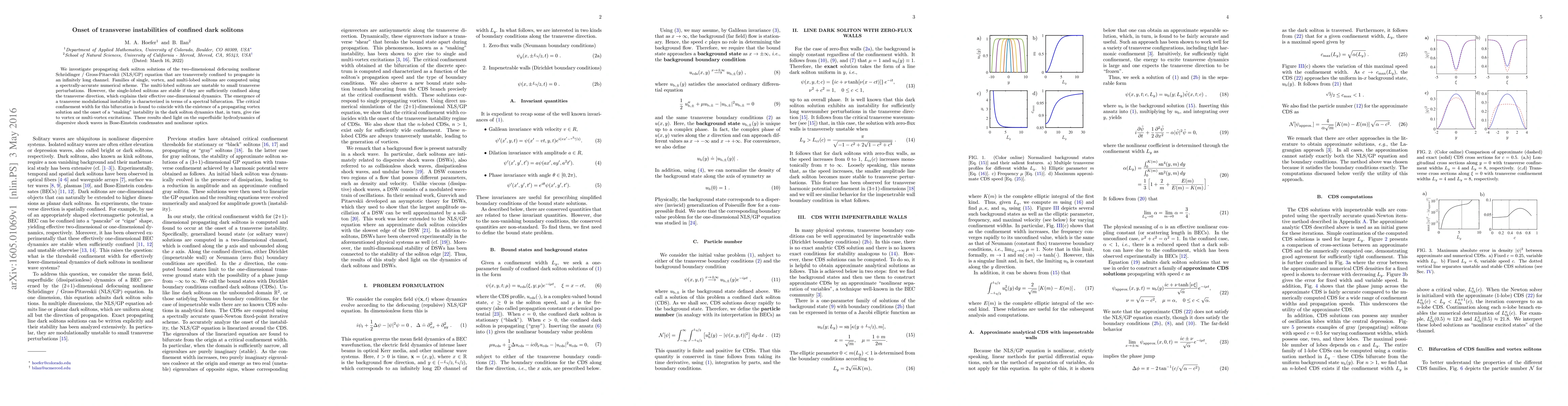 This research examines transverse instabilities in dark solitons confined to propagate in an infinitely long channel, revealing that multi-lobed solitons are unstable, while sufficiently confined single-lobed solitons remain stable. The study identifies a critical confinement width where a transverse modulational instability begins, leading to "snaking" and vortex excitations, relevant to superfluidic hydrodynamics and nonlinear optics.