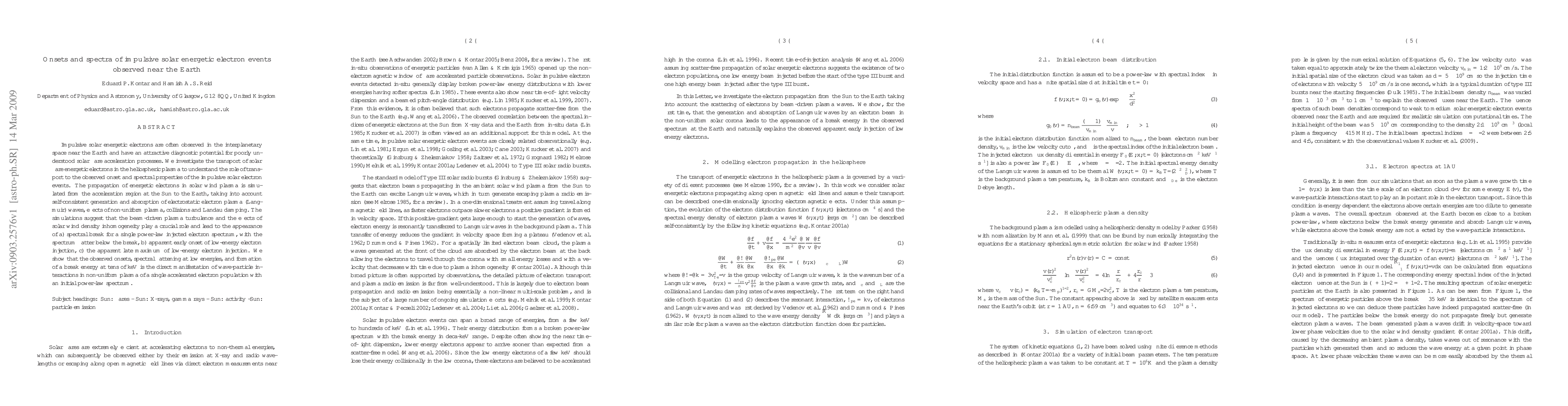 This paper investigates the transport of impulsive solar energetic electrons in the heliospheric plasma, revealing that beam-driven plasma turbulence and solar wind density inhomogeneity cause spectral breaks and early onsets in low-energy electron injections, directly linked to wave-particle interactions in non-uniform plasma.