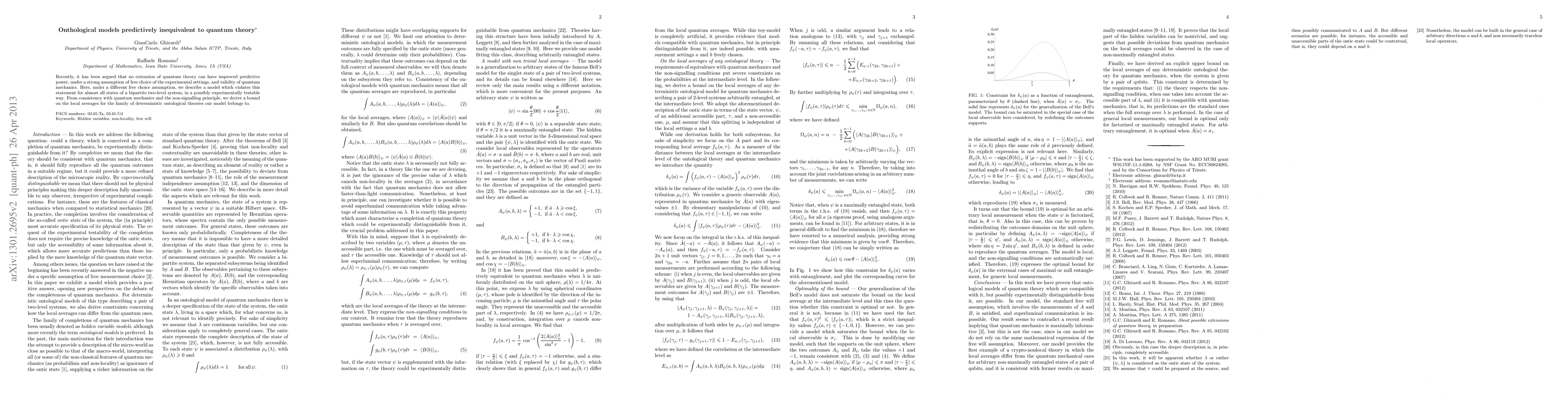 Recently, it has been argued that no extension of quantum theory can have improved predictive power under a strong assumption of free choice of the experimental settings and validity of quantum mechanics. Here, under a different free choice assumption, we describe a model which violates this statement for almost all states of a bipartite two-level system, in a possibly experimentally testable way. From consistency with quantum mechanics and the nonsignaling principle, we derive a bound on the local averages for the family of deterministic ontological theories that our model belongs to.