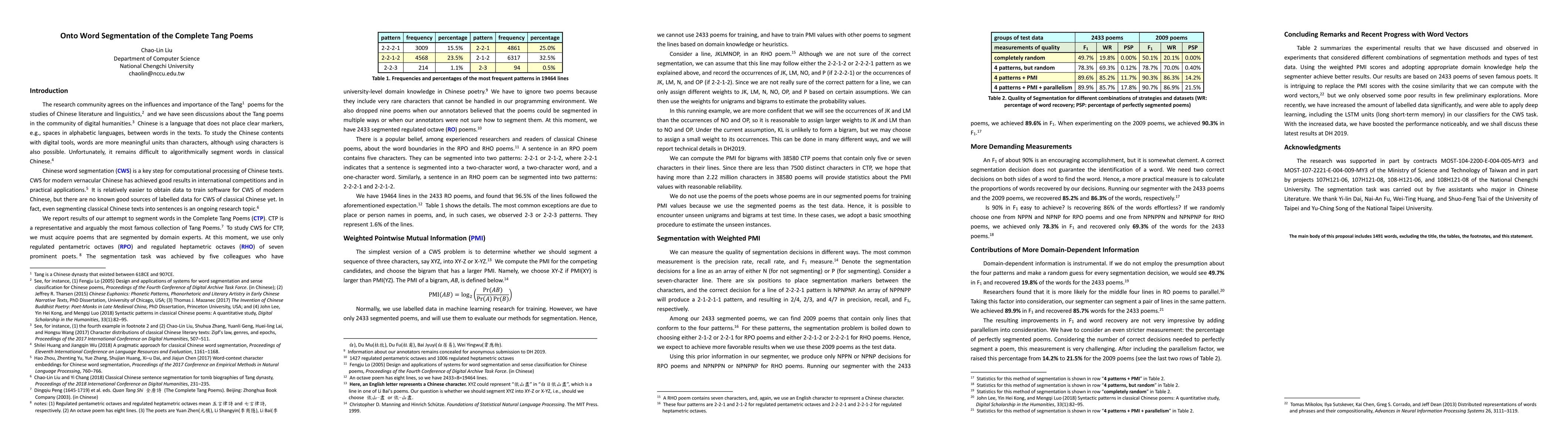 We aim at segmenting words in the Complete Tang Poems (CTP). Although it is possible to do some research about CTP without doing full-scale word segmentation, we must move forward to word-level analysis of CTP for conducting advanced research topics. In November 2018 when we submitted the manuscript for DH 2019 (ADHO), we collected only 2433 poems that were segmented by trained experts, and used the segmented poems to evaluate the segmenter that considered domain knowledge of Chinese poetry. We trained pointwise mutual information (PMI) between Chinese characters based on the CTP poems (excluding the 2433 poems, which were used exclusively only for testing) and the domain knowledge. The segmenter relied on the PMI information to the recover 85.7% of words in the test poems. We could segment a poem completely correct only 17.8% of the time, however. When we presented our work at DH 2019, we have annotated more than 20000 poems. With a much larger amount of data, we were able to apply biLSTM models for this word segmentation task, and we segmented a poem completely correct above 20% of the time. In contrast, human annotators completely agreed on their annotations about 40% of the time.