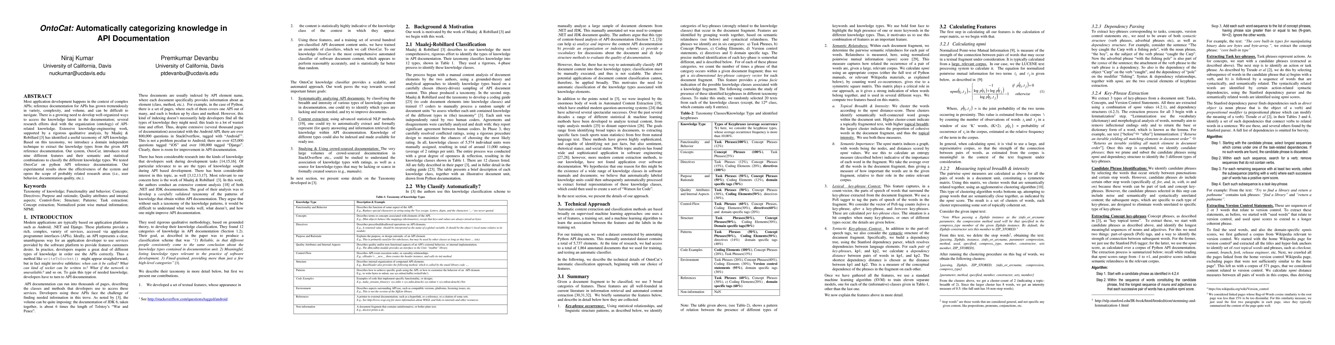 OntoCat is a domain-independent technique for automatically categorizing knowledge types in API documentation using nine features and their combinations. Experimental results on Python API documentation demonstrate its effectiveness and potential for related research areas.