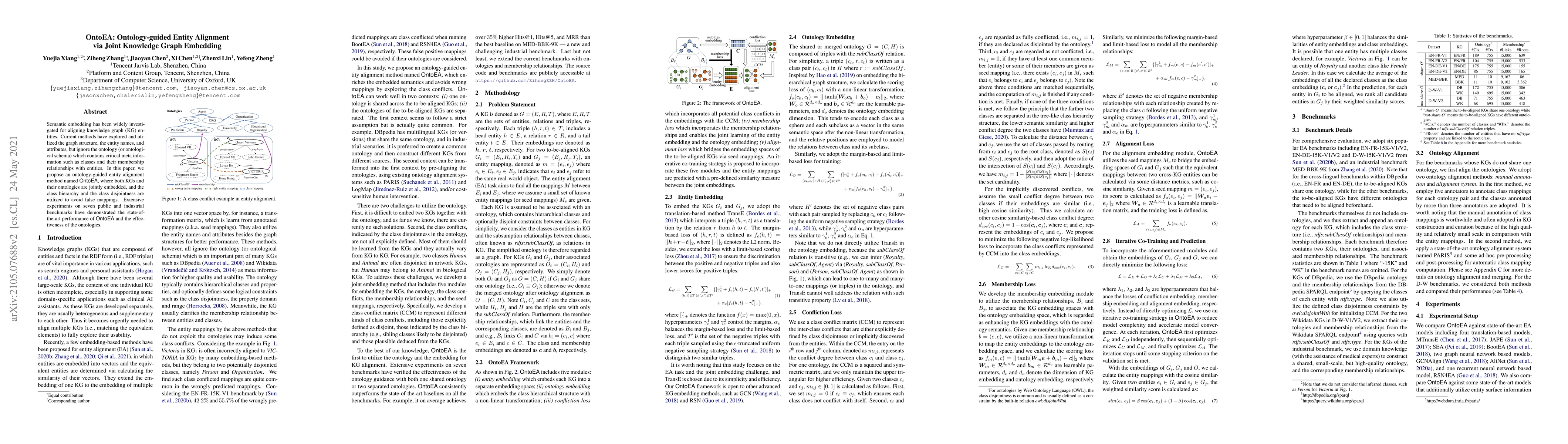 OntoEA is an ontology-guided method for entity alignment that jointly embeds knowledge graphs and their ontologies to leverage class hierarchies and relationships for accurate mappings. Experiments show OntoEA achieves state-of-the-art performance by effectively utilizing ontological schema.