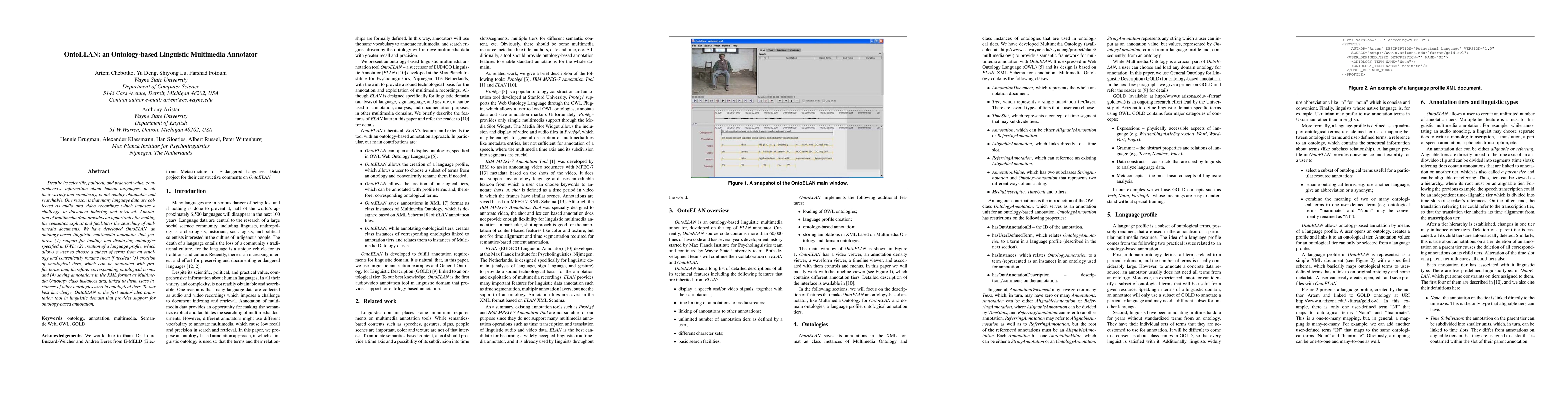 OntoELAN is an innovative ontology-based tool for annotating linguistic multimedia data, facilitating the explicit semantics of audio and video recordings. It supports ontology integration, language profile creation, ontological tiers annotation, and saves annotations in XML format linked to relevant ontologies.