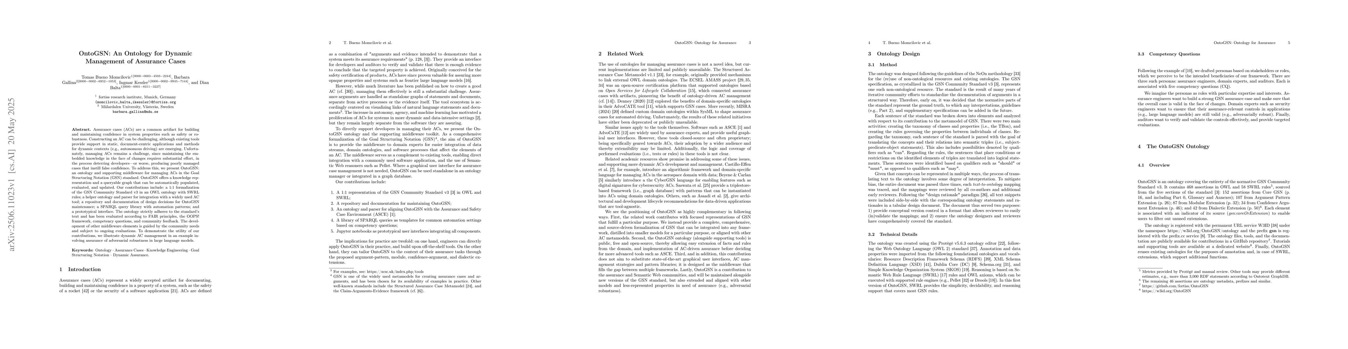 Assurance cases (ACs) are a common artifact for building and maintaining confidence in system properties such as safety or robustness. Constructing an AC can be challenging, although existing tools provide support in static, document-centric applications and methods for dynamic contexts (e.g., autonomous driving) are emerging. Unfortunately, managing ACs remains a challenge, since maintaining the embedded knowledge in the face of changes requires substantial effort, in the process deterring developers - or worse, producing poorly managed cases that instill false confidence. To address this, we present OntoGSN: an ontology and supporting middleware for managing ACs in the Goal Structuring Notation (GSN) standard. OntoGSN offers a knowledge representation and a queryable graph that can be automatically populated, evaluated, and updated. Our contributions include: a 1:1 formalization of the GSN Community Standard v3 in an OWL ontology with SWRL rules; a helper ontology and parser for integration with a widely used AC tool; a repository and documentation of design decisions for OntoGSN maintenance; a SPARQL query library with automation patterns; and a prototypical interface. The ontology strictly adheres to the standard's text and has been evaluated according to FAIR principles, the OOPS framework, competency questions, and community feedback. The development of other middleware elements is guided by the community needs and subject to ongoing evaluations. To demonstrate the utility of our contributions, we illustrate dynamic AC management in an example involving assurance of adversarial robustness in large language models.