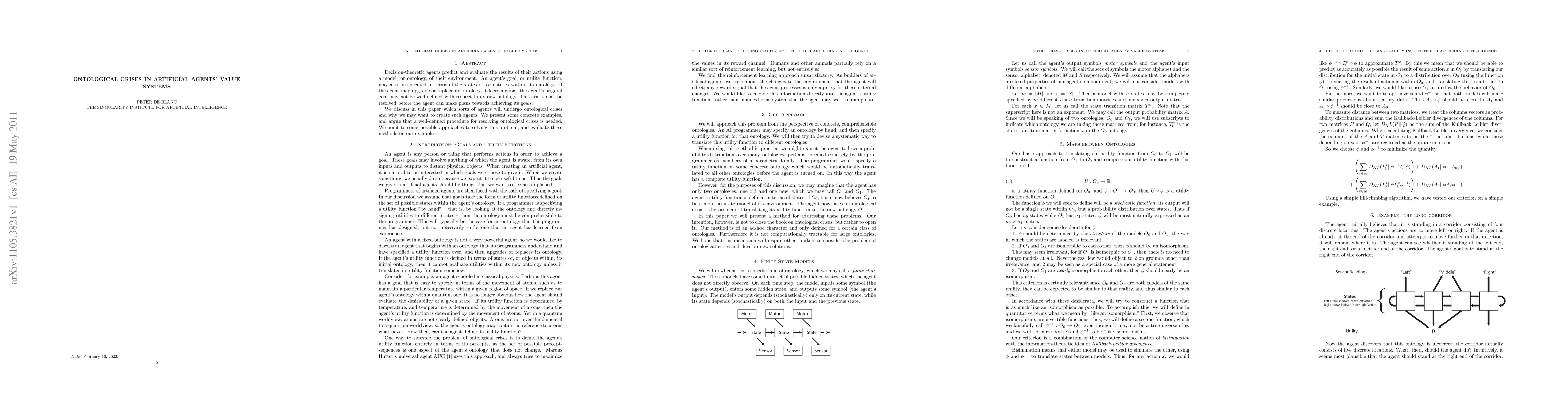Decision-theoretic agents predict and evaluate the results of their actions using a model, or ontology, of their environment. An agent's goal, or utility function, may also be specified in terms of the states of, or entities within, its ontology. If the agent may upgrade or replace its ontology, it faces a crisis: the agent's original goal may not be well-defined with respect to its new ontology. This crisis must be resolved before the agent can make plans towards achieving its goals. We discuss in this paper which sorts of agents will undergo ontological crises and why we may want to create such agents. We present some concrete examples, and argue that a well-defined procedure for resolving ontological crises is needed. We point to some possible approaches to solving this problem, and evaluate these methods on our examples.