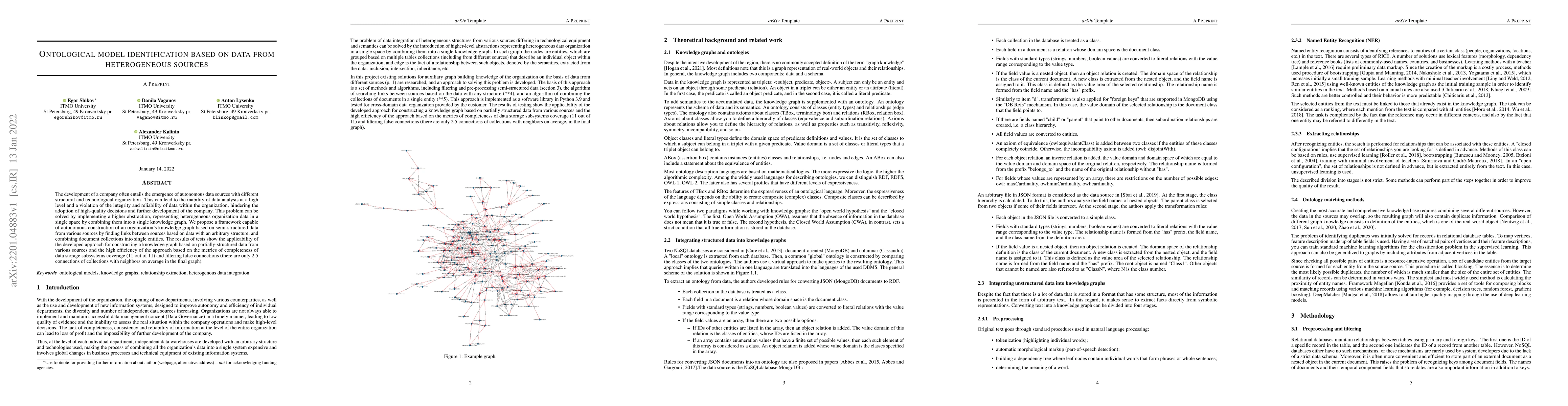 The development of a company often entails the emergence of autonomous data sources with different structural and technological organization. This can lead to the inability of data analysis at a high level and a violation of the integrity and reliability of data within the organization, hindering the adoption of high-quality decisions and further development of the company. This problem can be solved by implementing a higher abstraction, representing heterogeneous organization data in a single space by combining them into a single knowledge graph. We propose a framework capable of autonomous construction of an organization's knowledge graph based on semi-structured data from various sources by finding links between sources based on data with an arbitrary structure, and combining document collections into single entities. The results of tests show the applicability of the developed approach for constructing a knowledge graph based on partially-structured data from various sources and the high efficiency of the approach based on the metrics of completeness of data storage subsystems coverage (11 out of 11) and filtering false connections (there are only 2.5 connections of collections with neighbors on average in the final graph).