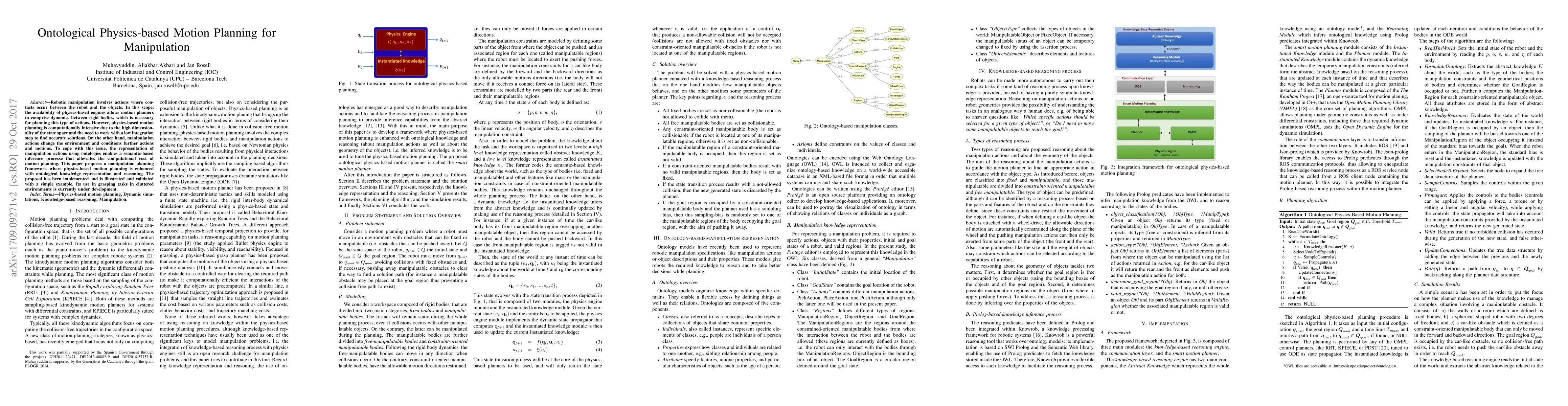 This paper proposes a framework for robotic manipulation using ontological physics-based motion planning, which combines physics simulations with semantic inference to reduce computational costs. The approach is validated with a simple example and is being developed for grasping tasks in cluttered environments.