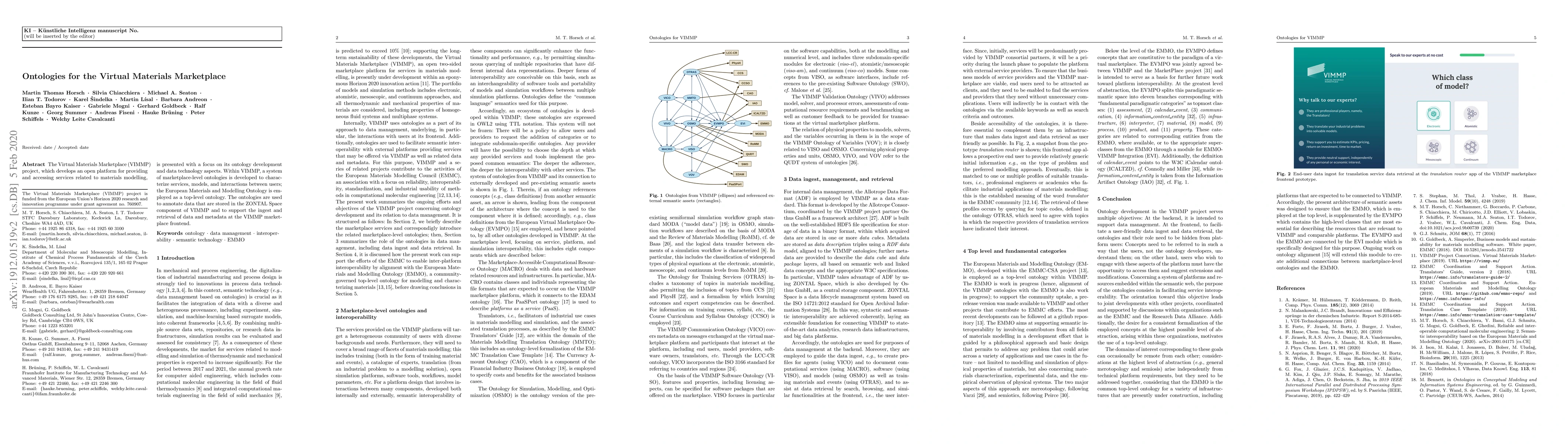 The VIMMP project creates an open platform for materials modelling services, utilizing a system of marketplace-level ontologies based on the EMMO top-level ontology to characterize services and interactions. These ontologies annotate data in the ZONTAL Space, facilitating data and metadata retrieval at the VIMMP marketplace frontend.