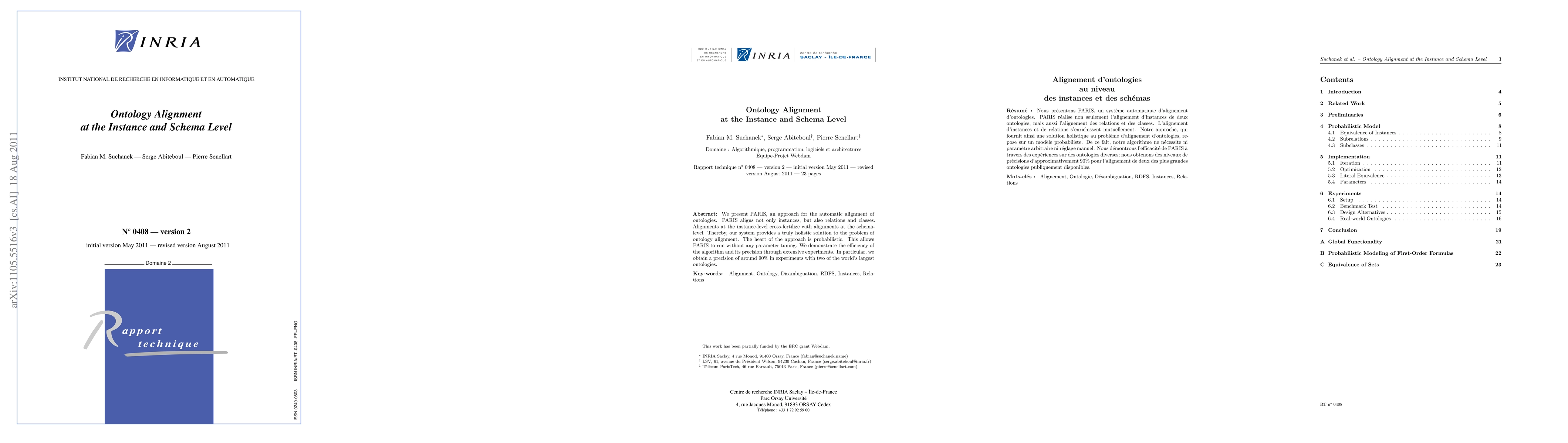 We present PARIS, an approach for the automatic alignment of ontologies. PARIS aligns not only instances, but also relations and classes. Alignments at the instance-level cross-fertilize with alignments at the schema-level. Thereby, our system provides a truly holistic solution to the problem of ontology alignment. The heart of the approach is probabilistic. This allows PARIS to run without any parameter tuning. We demonstrate the efficiency of the algorithm and its precision through extensive experiments. In particular, we obtain a precision of around 90% in experiments with two of the world's largest ontologies.