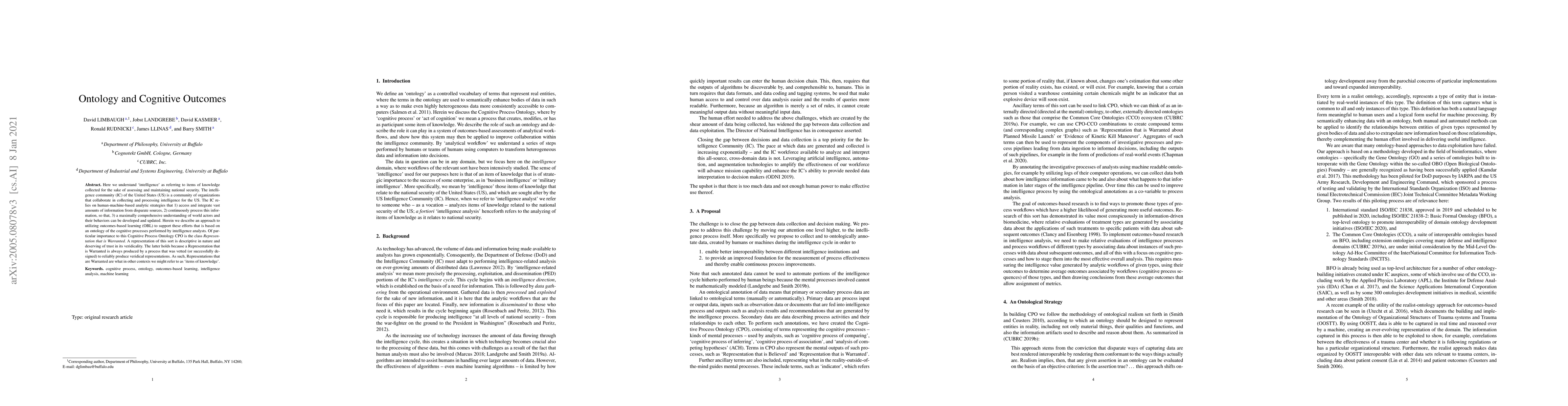 Here we understand 'intelligence' as referring to items of knowledge collected for the sake of assessing and maintaining national security. The intelligence community (IC) of the United States (US) is a community of organizations that collaborate in collecting and processing intelligence for the US. The IC relies on human-machine-based analytic strategies that 1) access and integrate vast amounts of information from disparate sources, 2) continuously process this information, so that, 3) a maximally comprehensive understanding of world actors and their behaviors can be developed and updated. Herein we describe an approach to utilizing outcomes-based learning (OBL) to support these efforts that is based on an ontology of the cognitive processes performed by intelligence analysts. Of particular importance to the Cognitive Process Ontology is the class Representation that is Warranted. Such a representation is descriptive in nature and deserving of trust in its veridicality. The latter is because a Representation that is Warranted is always produced by a process that was vetted (or successfully designed) to reliably produce veridical representations. As such, Representations that are Warranted are what in other contexts we might refer to as 'items of knowledge'.