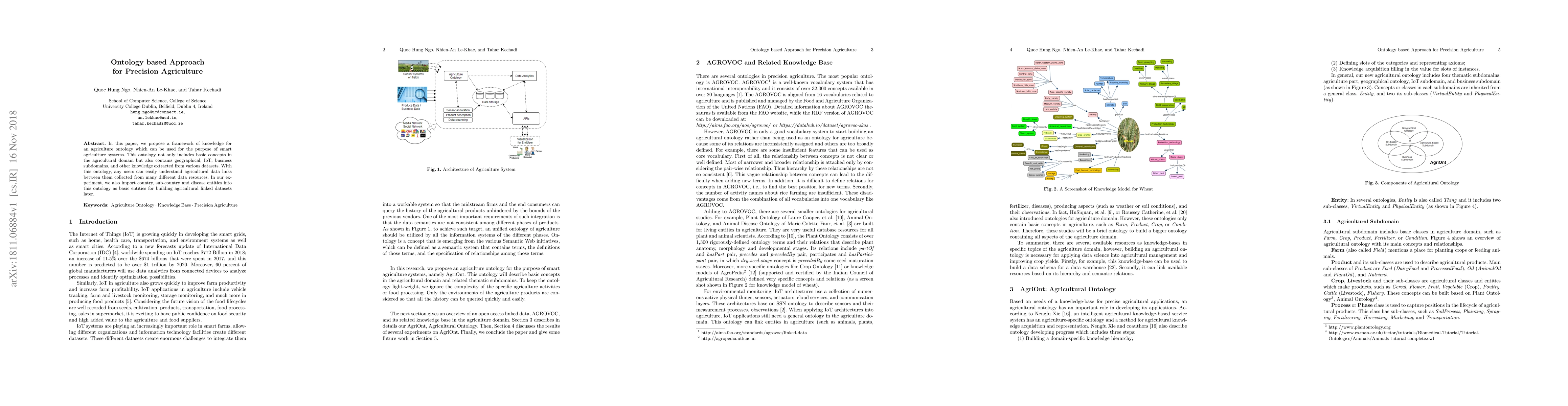 In this paper, we propose a framework of knowledge for an agriculture ontology which can be used for the purpose of smart agriculture systems. This ontology not only includes basic concepts in the agricultural domain but also contains geographical, IoT, business subdomains, and other knowledge extracted from various datasets. With this ontology, any users can easily understand agricultural data links between them collected from many different data resources. In our experiment, we also import country, sub-country and disease entities into this ontology as basic entities for building agricultural linked datasets later.