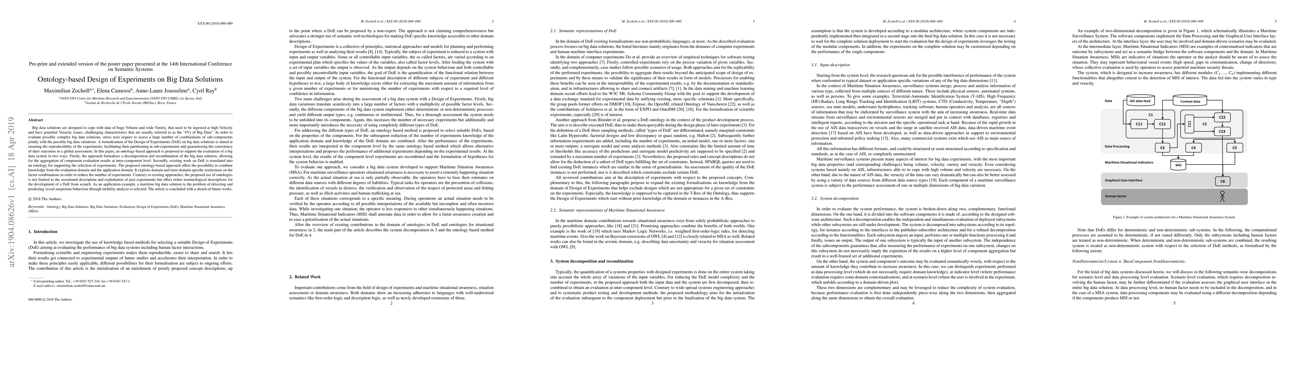 Big data solutions are designed to cope with data of huge Volume and wide Variety, that need to be ingested at high Velocity and have potential Veracity issues, challenging characteristics that are usually referred to as the "4Vs of Big Data". In order to evaluate possibly complex big data solutions, stress tests require to assess a large number of combinations of sub-components jointly with the possible big data variations. A formalization of the Design of Experiments (DoE) on big data solutions is aimed at ensuring the reproducibility of the experiments, facilitating their partitioning in sub-experiments and guaranteeing the consistency of their outcomes in a global assessment. In this paper, an ontology-based approach is proposed to support the evaluation of a big data system in two ways. Firstly, the approach formalizes a decomposition and recombination of the big data solution, allowing for the aggregation of component evaluation results at inter-component level. Secondly, existing work on DoE is translated into an ontology for supporting the selection of experiments. The proposed ontology-based approach offers the possibility to combine knowledge from the evaluation domain and the application domain. It exploits domain and inter-domain specific restrictions on the factor combinations in order to reduce the number of experiments. Contrary to existing approaches, the proposed use of ontologies is not limited to the assertional description and exploitation of past experiments but offers richer terminological descriptions for the development of a DoE from scratch. As an application example, a maritime big data solution to the problem of detecting and predicting vessel suspicious behaviour through mobility analysis is selected. The article is concluded with a sketch of future works.