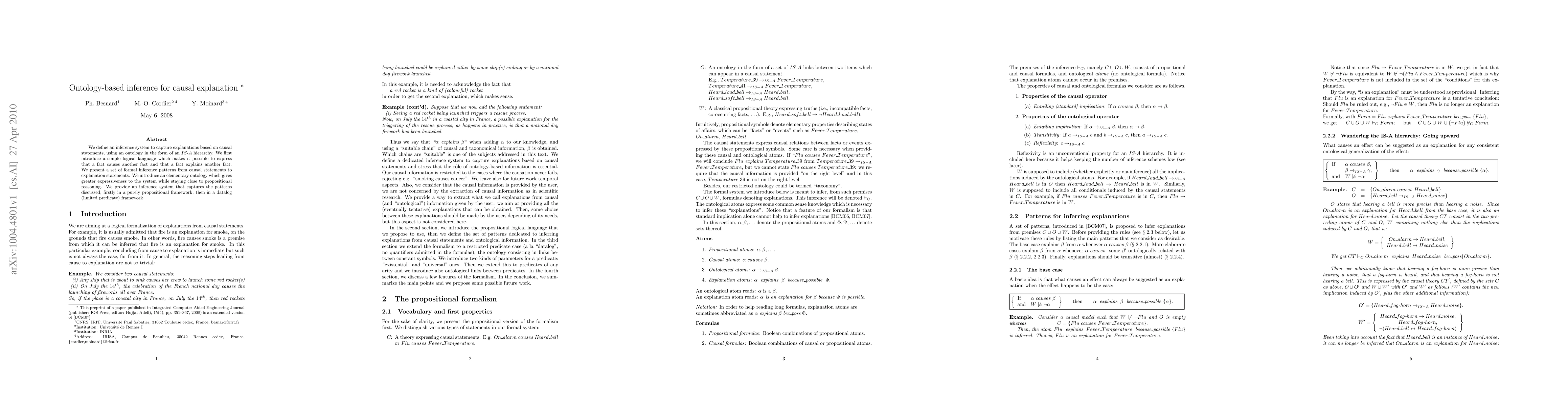 This paper proposes an inference system using an ontology-based approach to derive causal explanations from causal statements, employing an IS-A hierarchy. It introduces formal inference patterns to convert causal statements into explanation statements within both propositional and datalog frameworks.