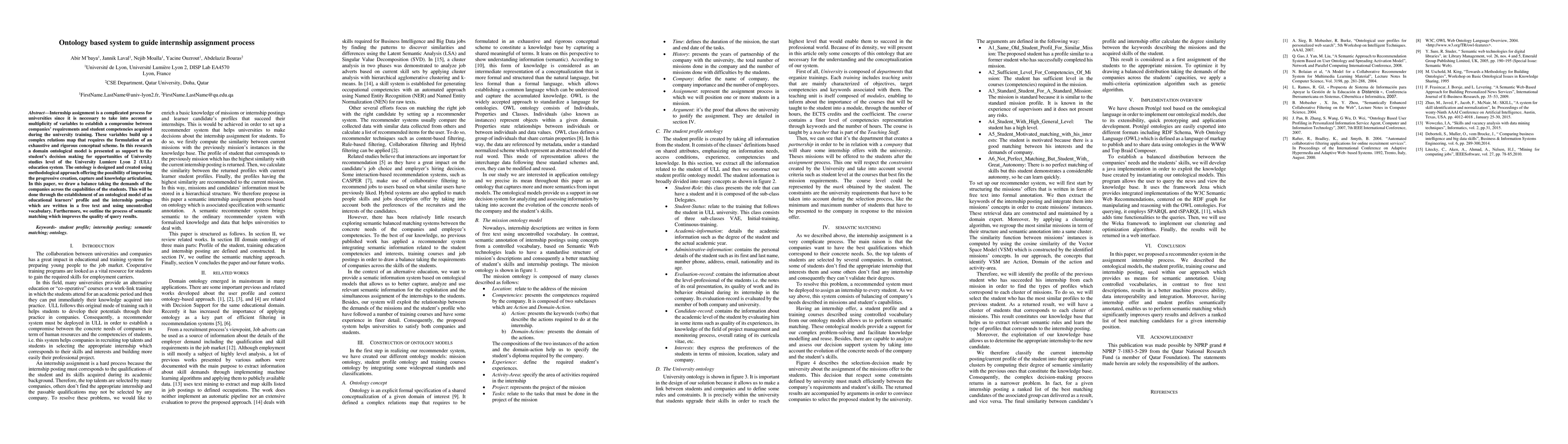 A domain ontological model helps guide internship assignment process at University Lumiere Lyon 2 by balancing company demands with student capabilities, improving decision making.