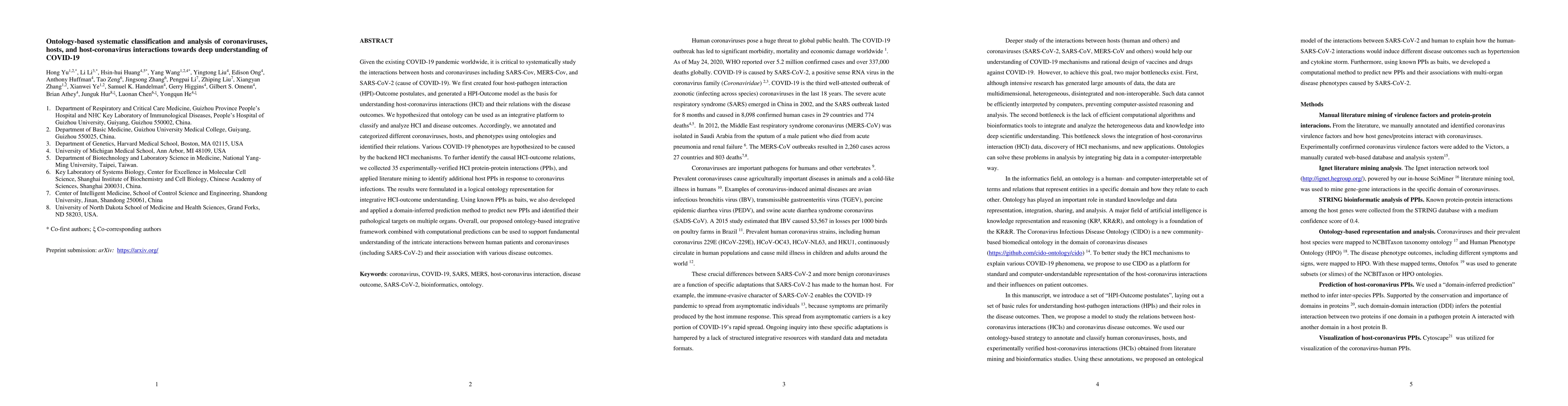 Given the existing COVID-19 pandemic worldwide, it is critical to systematically study the interactions between hosts and coronaviruses including SARS-Cov, MERS-Cov, and SARS-CoV-2 (cause of COVID-19). We first created four host-pathogen interaction (HPI)-Outcome postulates, and generated a HPI-Outcome model as the basis for understanding host-coronavirus interactions (HCI) and their relations with the disease outcomes. We hypothesized that ontology can be used as an integrative platform to classify and analyze HCI and disease outcomes. Accordingly, we annotated and categorized different coronaviruses, hosts, and phenotypes using ontologies and identified their relations. Various COVID-19 phenotypes are hypothesized to be caused by the backend HCI mechanisms. To further identify the causal HCI-outcome relations, we collected 35 experimentally-verified HCI protein-protein interactions (PPIs), and applied literature mining to identify additional host PPIs in response to coronavirus infections. The results were formulated in a logical ontology representation for integrative HCI-outcome understanding. Using known PPIs as baits, we also developed and applied a domain-inferred prediction method to predict new PPIs and identified their pathological targets on multiple organs. Overall, our proposed ontology-based integrative framework combined with computational predictions can be used to support fundamental understanding of the intricate interactions between human patients and coronaviruses (including SARS-CoV-2) and their association with various disease outcomes.
