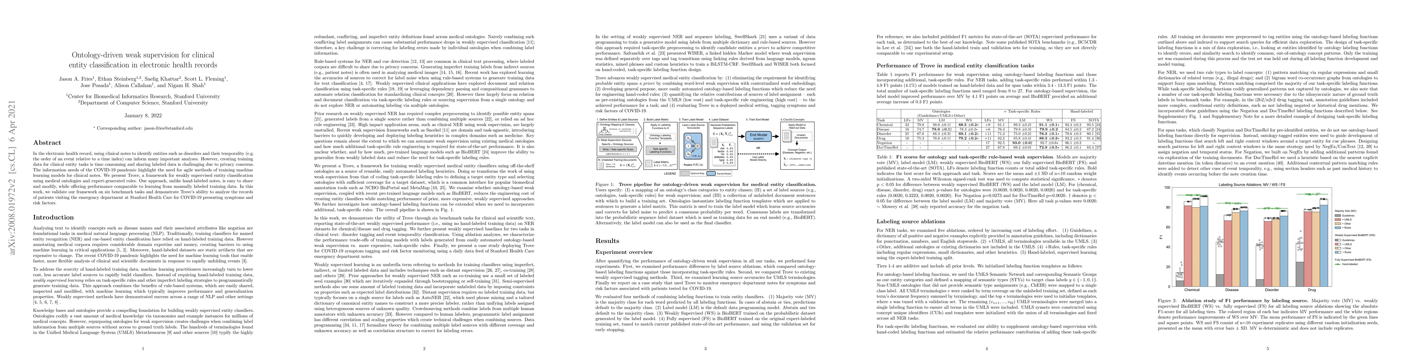 This paper introduces Trove, a weakly supervised framework for clinical entity classification in electronic health records, leveraging medical ontologies and expert rules to address the challenge of creating training data. The approach enables agile model training and offers performance comparable to manually labeled data, validated on six benchmark tasks.