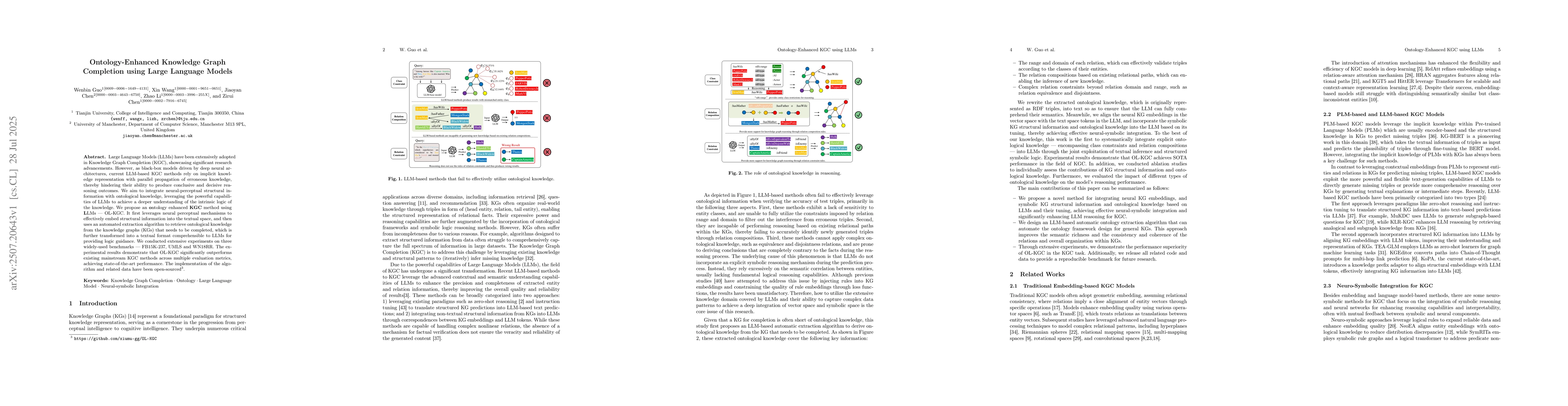 Large Language Models (LLMs) have been extensively adopted in Knowledge Graph Completion (KGC), showcasing significant research advancements. However, as black-box models driven by deep neural architectures, current LLM-based KGC methods rely on implicit knowledge representation with parallel propagation of erroneous knowledge, thereby hindering their ability to produce conclusive and decisive reasoning outcomes. We aim to integrate neural-perceptual structural information with ontological knowledge, leveraging the powerful capabilities of LLMs to achieve a deeper understanding of the intrinsic logic of the knowledge. We propose an ontology enhanced KGC method using LLMs -- OL-KGC. It first leverages neural perceptual mechanisms to effectively embed structural information into the textual space, and then uses an automated extraction algorithm to retrieve ontological knowledge from the knowledge graphs (KGs) that needs to be completed, which is further transformed into a textual format comprehensible to LLMs for providing logic guidance. We conducted extensive experiments on three widely-used benchmarks -- FB15K-237, UMLS and WN18RR. The experimental results demonstrate that OL-KGC significantly outperforms existing mainstream KGC methods across multiple evaluation metrics, achieving state-of-the-art performance.