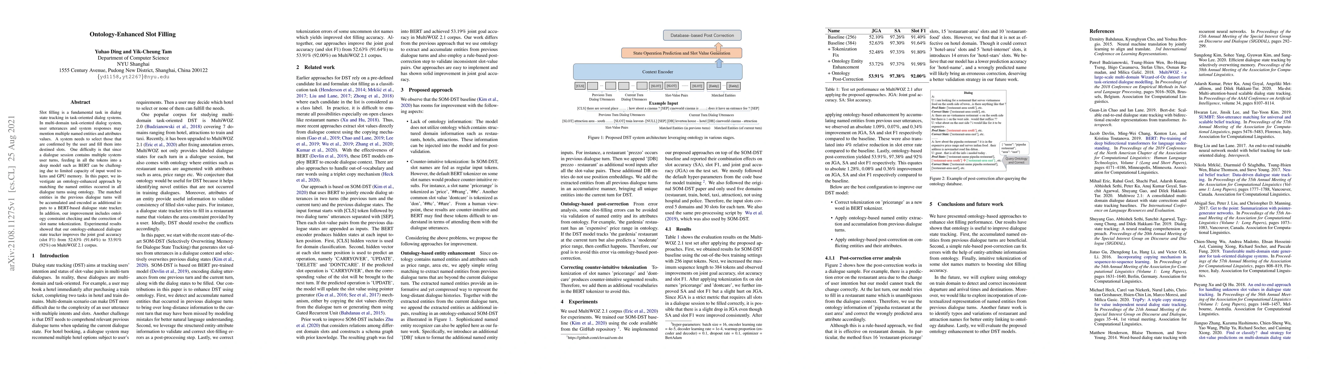 This paper proposes an ontology-enhanced slot filling approach for multi-domain dialog systems that utilizes ontology to match and encode named entities from previous dialogue turns, improving BERT-based state tracking. Experimental results demonstrate an enhancement in joint goal accuracy.