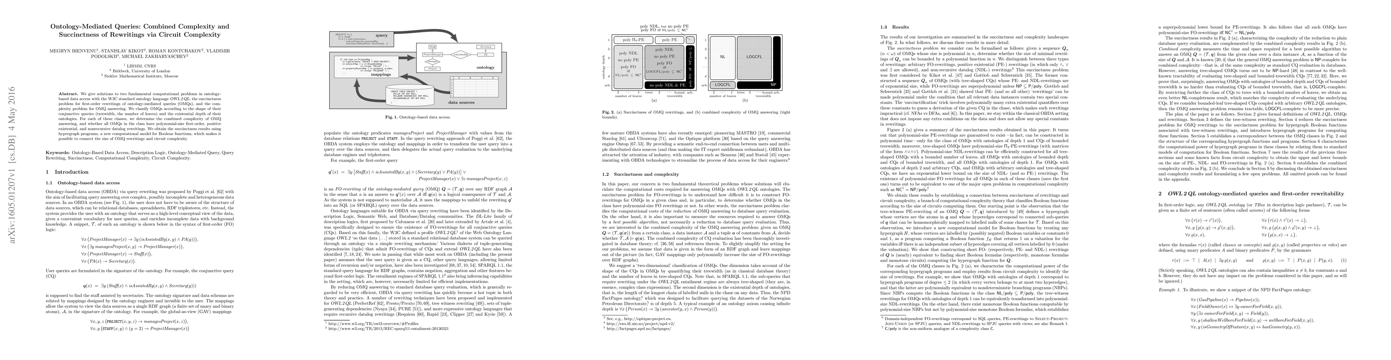 This paper addresses the succinctness and complexity of ontology-mediated queries (OMQs) in OWL 2 QL, classifying OMQs based on query and ontology characteristics. It determines the combined complexity of OMQ answering and the existence of polynomial-size rewritings, leveraging hypergraph programs to connect rewriting size with circuit complexity.