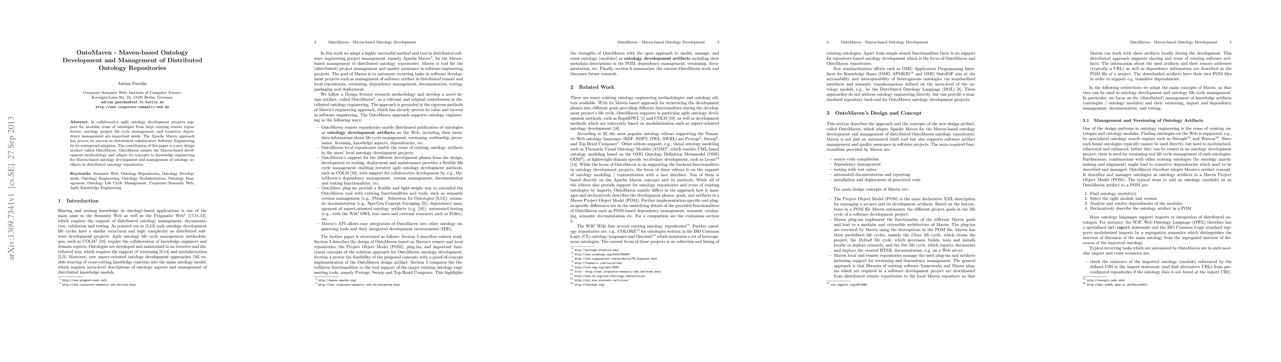 OntoMaven leverages the Apache Maven approach to facilitate collaborative agile ontology development, supporting modular reuse from remote repositories and managing transitive dependencies. It adapts Maven-based concepts for effective ontology project lifecycle management in distributed environments.