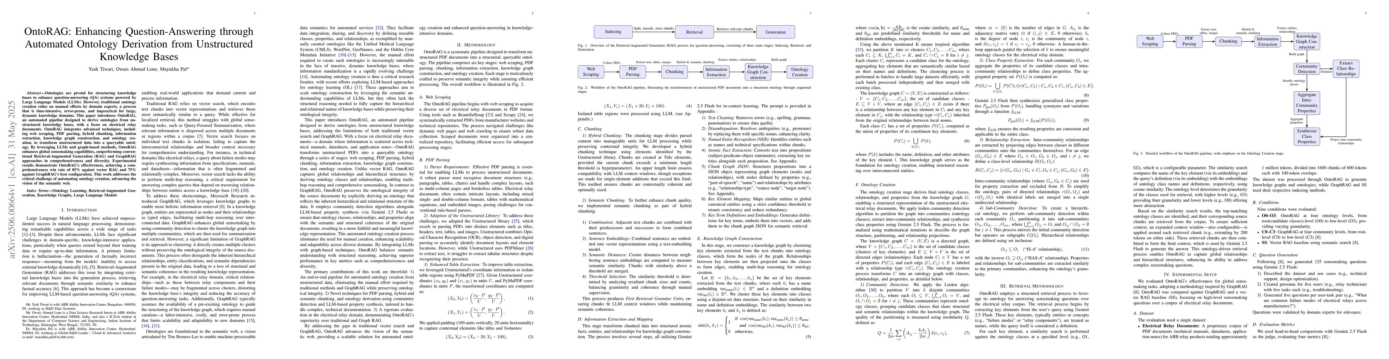 Ontologies are pivotal for structuring knowledge bases to enhance question answering (QA) systems powered by Large Language Models (LLMs). However, traditional ontology creation relies on manual efforts by domain experts, a process that is time intensive, error prone, and impractical for large, dynamic knowledge domains. This paper introduces OntoRAG, an automated pipeline designed to derive ontologies from unstructured knowledge bases, with a focus on electrical relay documents. OntoRAG integrates advanced techniques, including web scraping, PDF parsing, hybrid chunking, information extraction, knowledge graph construction, and ontology creation, to transform unstructured data into a queryable ontology. By leveraging LLMs and graph based methods, OntoRAG enhances global sensemaking capabilities, outperforming conventional Retrieval Augmented Generation (RAG) and GraphRAG approaches in comprehensiveness and diversity. Experimental results demonstrate OntoRAGs effectiveness, achieving a comprehensiveness win rate of 85% against vector RAG and 75% against GraphRAGs best configuration. This work addresses the critical challenge of automating ontology creation, advancing the vision of the semantic web.