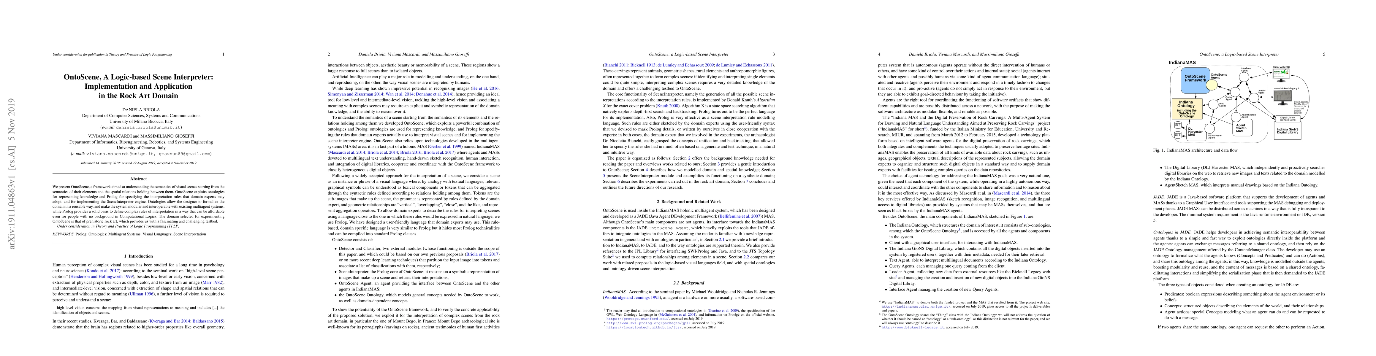 We present OntoScene, a framework aimed at understanding the semantics of visual scenes starting from the semantics of their elements and the spatial relations holding between them. OntoScene exploits ontologies for representing knowledge and Prolog for specifying the interpretation rules that domain experts may adopt, and for implementing the SceneInterpreter engine. Ontologies allow the designer to formalize the domain in a reusable way, and make the system modular and interoperable with existing multiagent systems, while Prolog provides a solid basis to define complex rules of interpretation in a way that can be affordable even for people with no background in Computational Logics. The domain selected for experimenting OntoScene is that of prehistoric rock art, which provides us with a fascinating and challenging testbed. Under consideration in Theory and Practice of Logic Programming (TPLP)