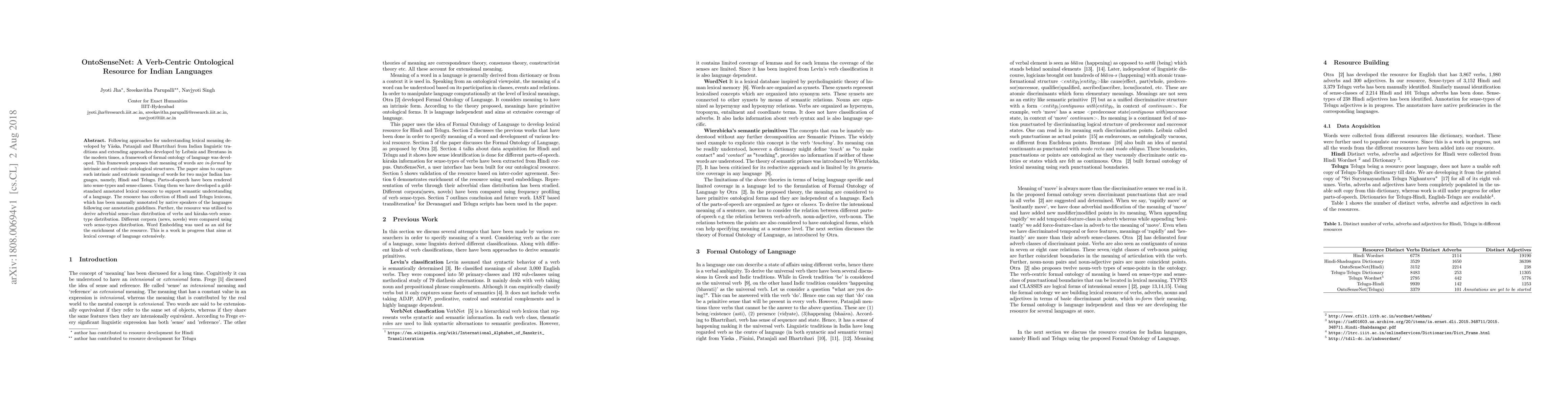 "OntoSenseNet is a verb-centric ontological resource for Hindi and Telugu languages, leveraging classical Indian linguistic traditions and modern ontology to annotate meanings, and is enriched with word embeddings for ongoing extensive lexical coverage."