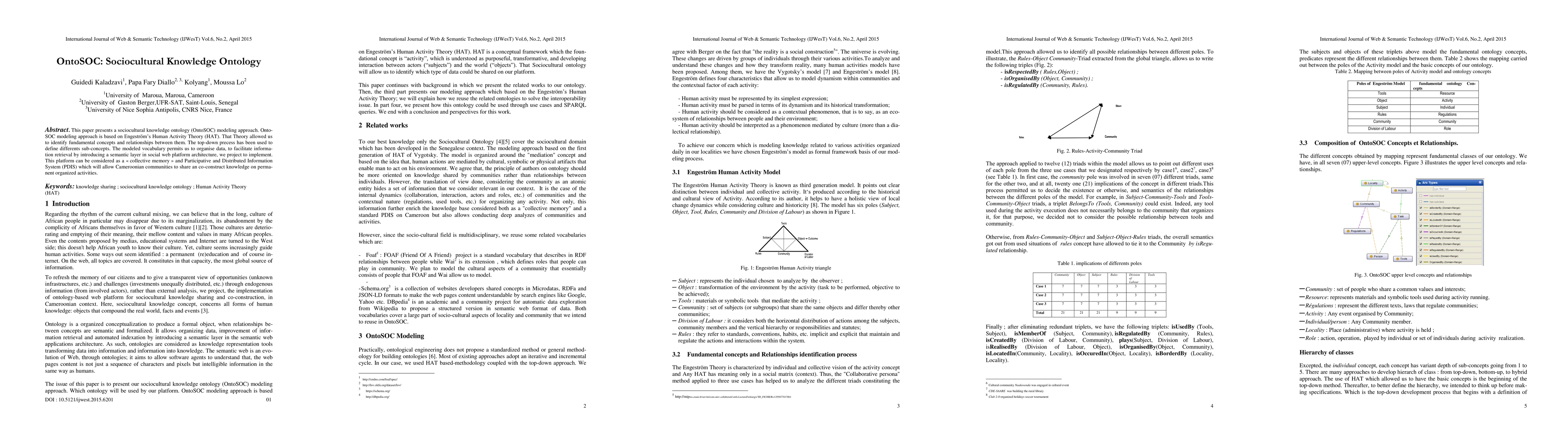 This paper presents a sociocultural knowledge ontology (OntoSOC) modeling approach. OntoSOC modeling approach is based on Engestrom Human Activity Theory (HAT). That Theory allowed us to identify fundamental concepts and relationships between them. The top-down precess has been used to define differents sub-concepts. The modeled vocabulary permits us to organise data, to facilitate information retrieval by introducing a semantic layer in social web platform architecture, we project to implement. This platform can be considered as a collective memory and Participative and Distributed Information System (PDIS) which will allow Cameroonian communities to share an co-construct knowledge on permanent organized activities.
