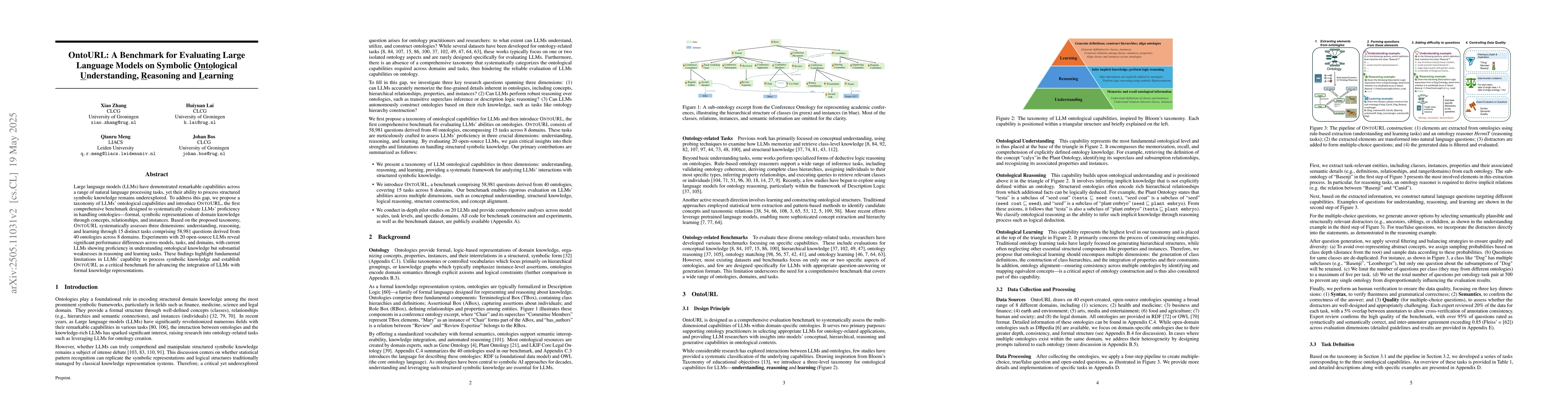 The research introduces OntoURL, a benchmark to evaluate large language models (LLMs) on their ontological understanding, reasoning, and learning capabilities. It proposes a taxonomy of LLMs' ontological capabilities and assesses these dimensions through 15 tasks derived from 40 ontologies across 8 domains.