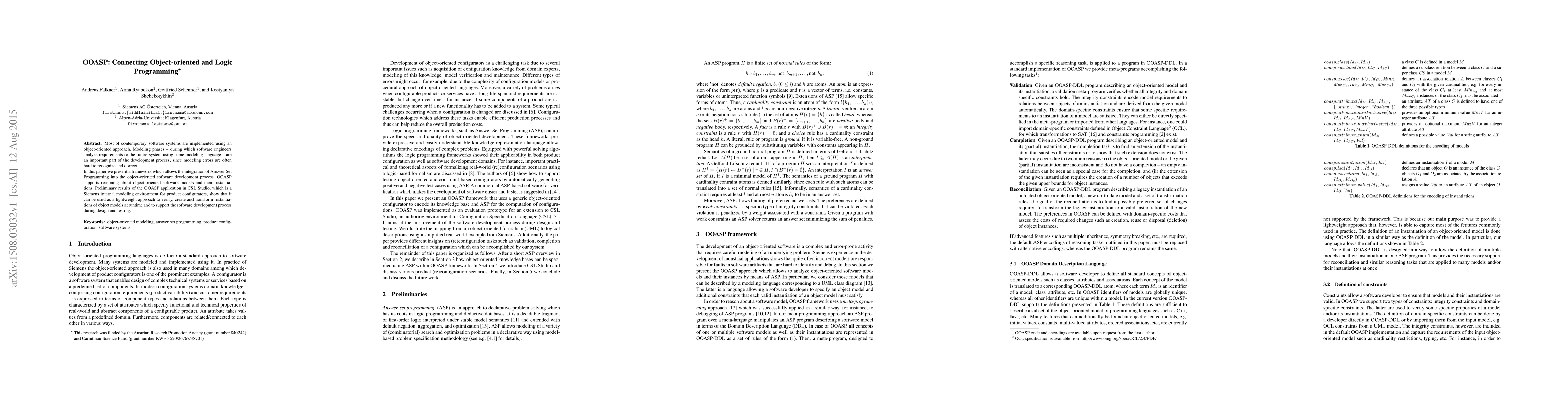 The research presents OOASP, a framework integrating Answer Set Programming (ASP) into the object-oriented software development process, supporting reasoning about object-oriented software models and their instantiations.