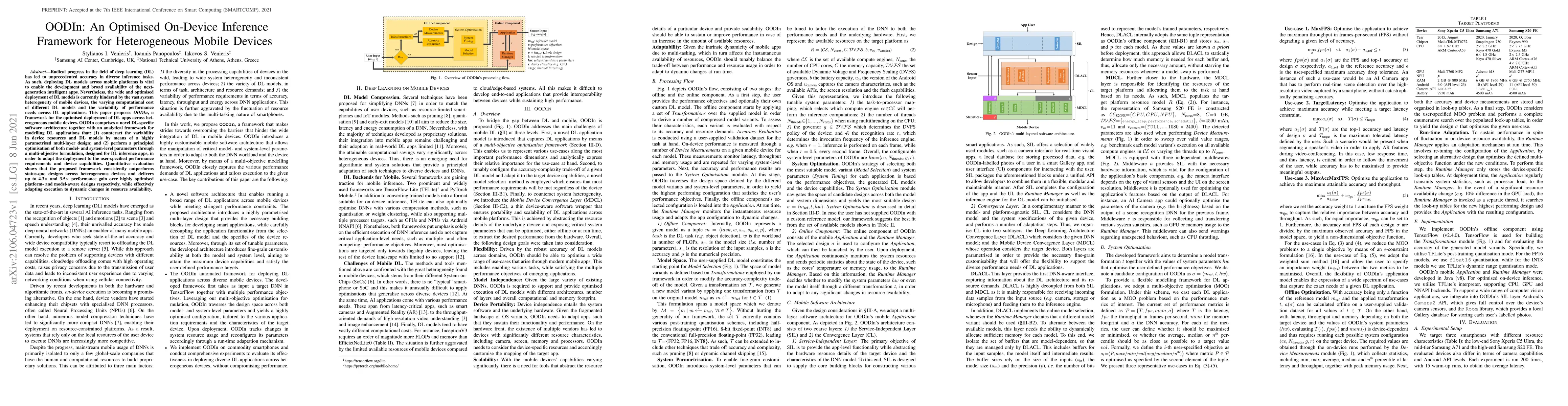 OODIn introduces a novel mobile software architecture and a multi-objective optimization framework for deep learning applications, enabling adaptive on-device inference tailored to device characteristics and performance needs.
