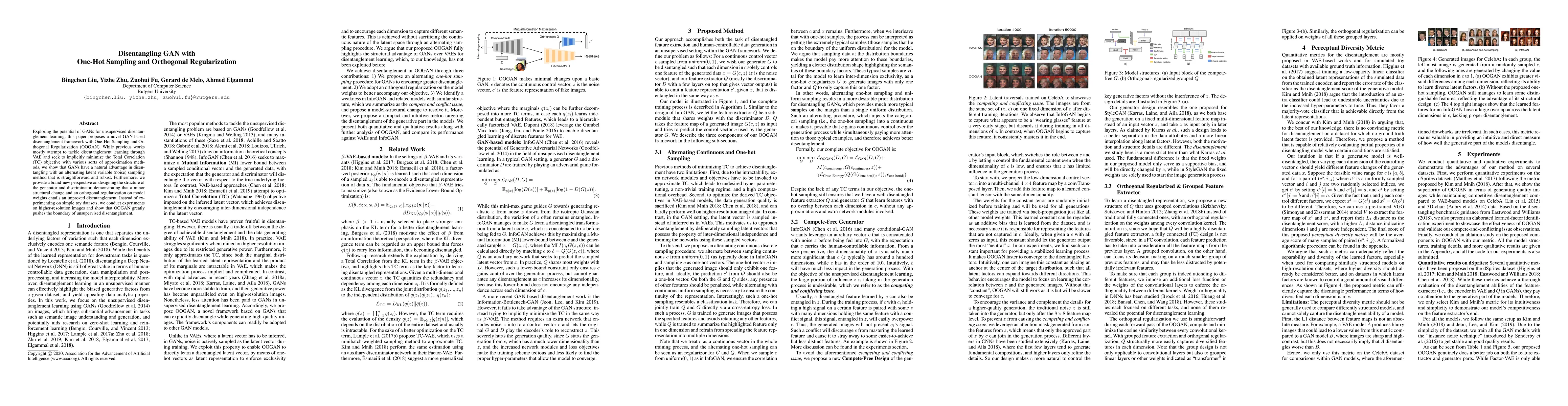 This paper introduces OOGAN, a novel GAN framework for unsupervised disentanglement learning using One-Hot Sampling and Orthogonal Regularization. Unlike VAE-based approaches, OOGAN leverages GANs' inherent advantages for robust disentanglement through an alternating latent variable sampling method, and demonstrates improved performance through structural changes and orthogonal regularization on model weights, validated on higher-resolution images.