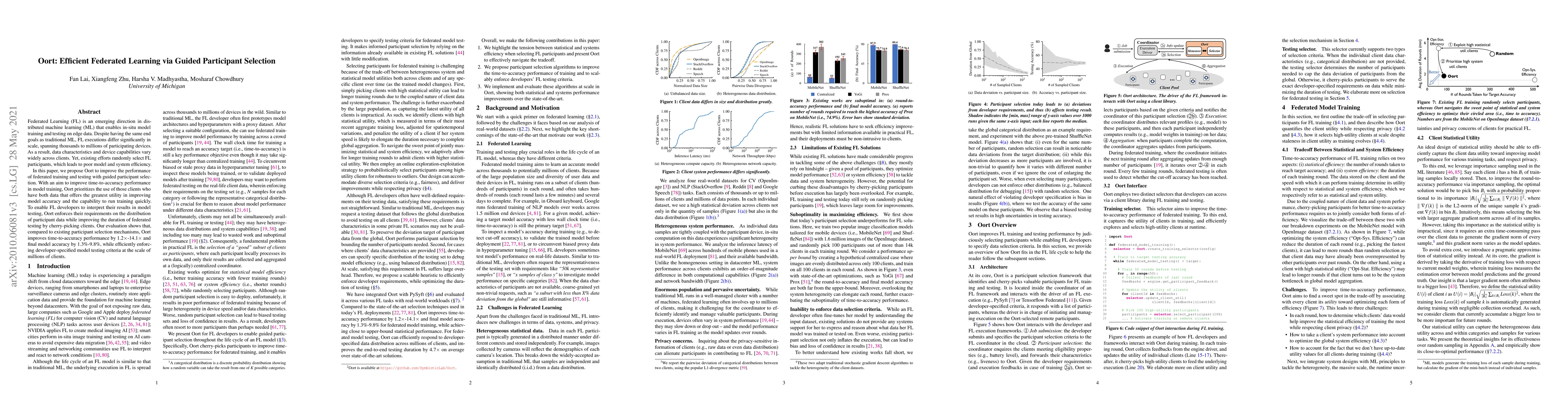 Federated Learning (FL) is an emerging direction in distributed machine learning (ML) that enables in-situ model training and testing on edge data. Despite having the same end goals as traditional ML, FL executions differ significantly in scale, spanning thousands to millions of participating devices. As a result, data characteristics and device capabilities vary widely across clients. Yet, existing efforts randomly select FL participants, which leads to poor model and system efficiency. In this paper, we propose Oort to improve the performance of federated training and testing with guided participant selection. With an aim to improve time-to-accuracy performance in model training, Oort prioritizes the use of those clients who have both data that offers the greatest utility in improving model accuracy and the capability to run training quickly. To enable FL developers to interpret their results in model testing, Oort enforces their requirements on the distribution of participant data while improving the duration of federated testing by cherry-picking clients. Our evaluation shows that, compared to existing participant selection mechanisms, Oort improves time-to-accuracy performance by 1.2x-14.1x and final model accuracy by 1.3%-9.8%, while efficiently enforcing developer-specified model testing criteria at the scale of millions of clients.