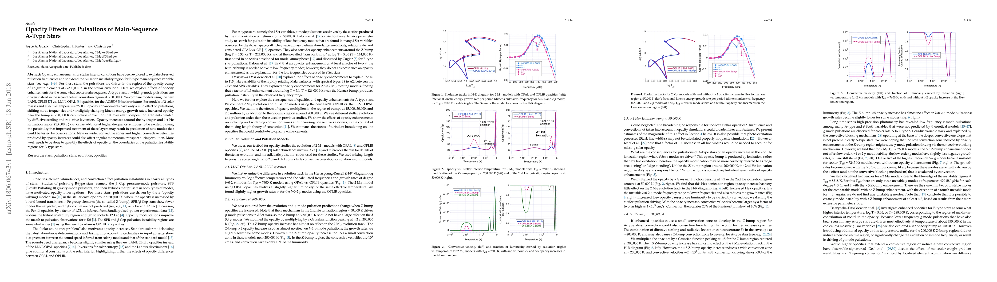 Opacity enhancements for stellar interior conditions have been explored to explain observed pulsation frequencies and to extend the pulsation instability region for B-type main-sequence variable stars. For these stars, the pulsations are driven in the region of the opacity bump of Fe-group elements at $\sim$200,000 K in the stellar envelope. Here we explore effects of opacity enhancements for the somewhat cooler main-sequence A-type stars, in which $p$-mode pulsations are driven instead in the second helium ionization region at $\sim$50,000 K. We compare models using the new LANL OPLIB vs. LLNL OPAL opacities for the AGSS09 solar mixture. For models of 2 solar masses and effective temperature 7600 K, opacity enhancements have only a mild effect on pulsations, shifting mode frequencies and/or slightly changing kinetic-energy growth rates. Increased opacity near the bump at 200,000 K can induce convection that may alter composition gradients created by diffusive settling and radiative levitation. Opacity increases around the hydrogen and 1st He ionization region (13,000 K) can cause additional higher-frequency $p$ modes to be excited, raising the possibility that improved treatment of these layers may result in prediction of new modes that could be tested by observations. New or wider convective zones and higher convective velocities produced by opacity increases could also affect angular momentum transport during evolution. More work needs to be done to quantify the effects of opacity on the boundaries of the pulsation instability regions for A-type stars.