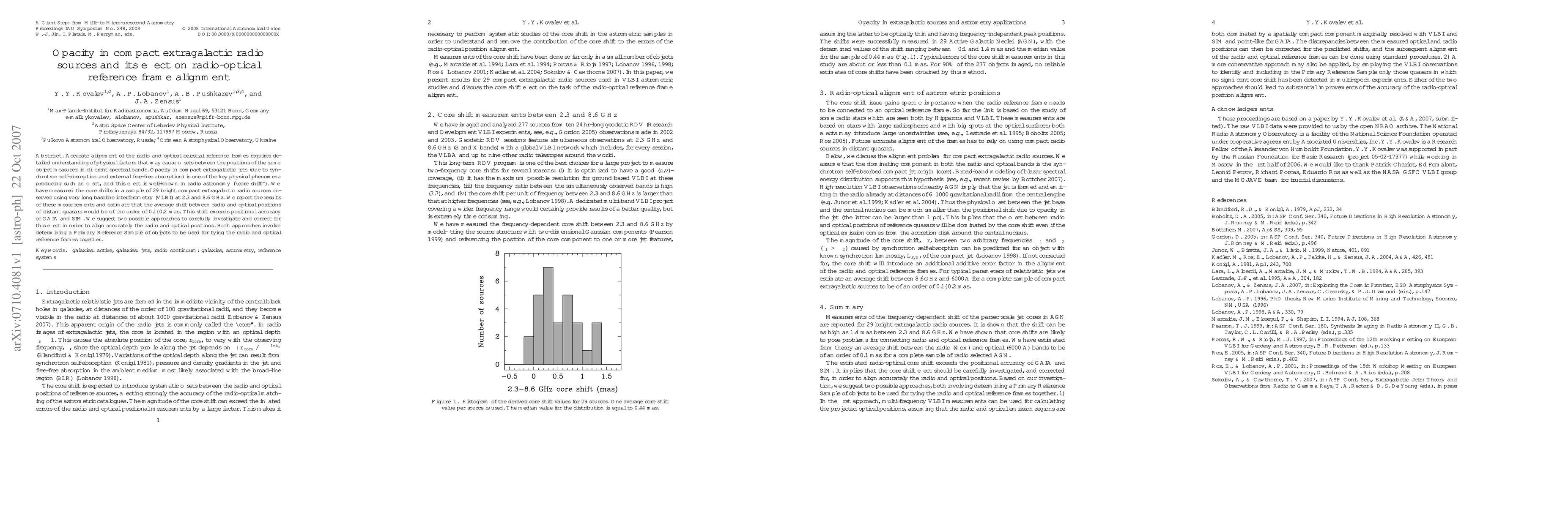 Accurate alignment of the radio and optical celestial reference frames requires detailed understanding of physical factors that may cause offsets between the positions of the same object measured in different spectral bands. Opacity in compact extragalactic jets (due to synchrotron self-absorption and external free-free absorption) is one of the key physical phenomena producing such an offset, and this effect is well-known in radio astronomy ("core shift"). We have measured the core shifts in a sample of 29 bright compact extragalactic radio sources observed using very long baseline interferometry (VLBI) at 2.3 and 8.6 GHz. We report the results of these measurements and estimate that the average shift between radio and optical positions of distant quasars would be of the order of 0.1-0.2 mas. This shift exceeds positional accuracy of GAIA and SIM. We suggest two possible approaches to carefully investigate and correct for this effect in order to align accurately the radio and optical positions. Both approaches involve determining a Primary Reference Sample of objects to be used for tying the radio and optical reference frames together.
