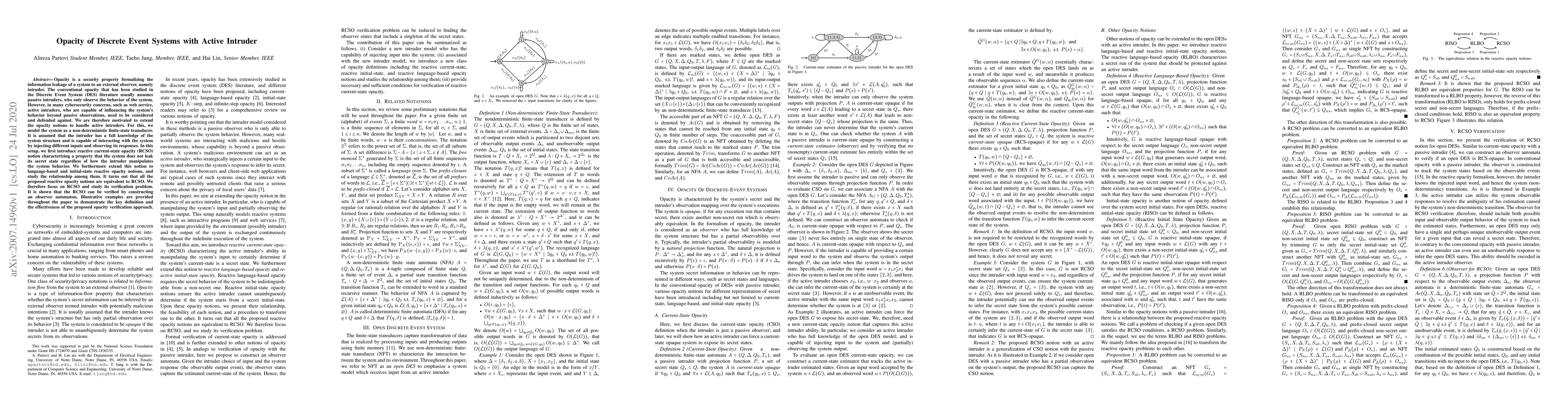 Researchers developed a new concept called reactive current-state opacity (RCSO) to measure how secure a system is against active intruders who can influence its behavior. They showed that RCSO can be verified by constructing an observer automaton.
