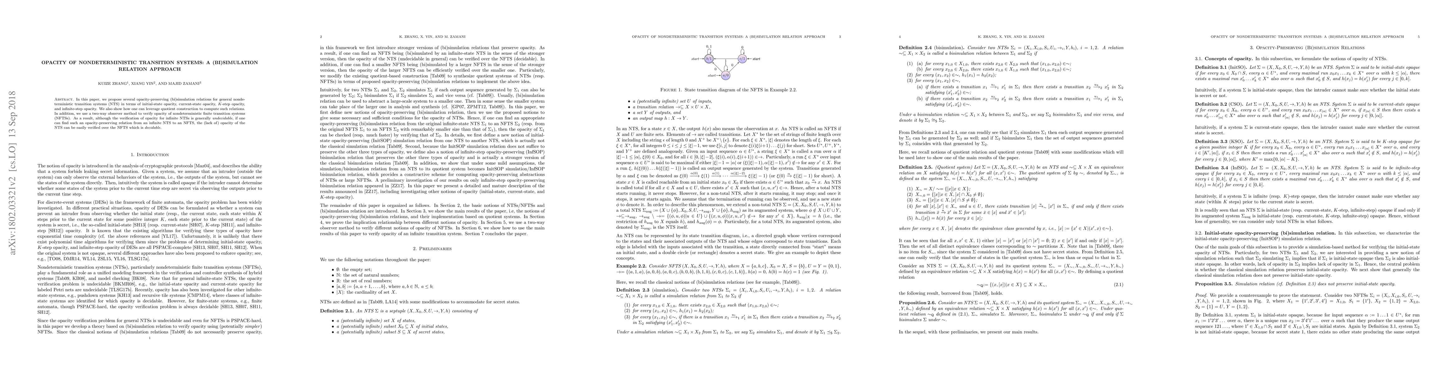 In this paper, we propose several opacity-preserving (bi)simulation relations for general nondeterministic transition systems (NTS) in terms of initial-state opacity, current-state opacity, K-step opacity, and infinite-step opacity. We also show how one can leverage quotient construction to compute such relations. In addition, we use a two-way observer method to verify opacity of nondeterministic finite transition systems (NFTSs). As a result, although the verification of opacity for infinite NTSs is generally undecidable, if one can find such an opacity-preserving relation from an infinite NTS to an NFTS, the (lack of) opacity of the NTS can be easily verified over the NFTS which is decidable.